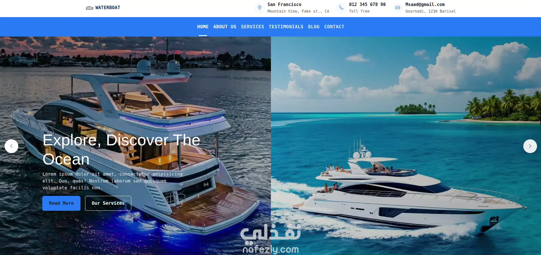 مشروع موقع إلكتروني تفاعلي بعنوان "WaterBoat" تم تصميمه باستخدام تقنيات HTML، CSS، و Bootstrap 5، ويُعد نموذجًا متكاملًا لموقع سياحي يهدف إلى تسويق خدمات تأجير اليخوت الفاخرة.