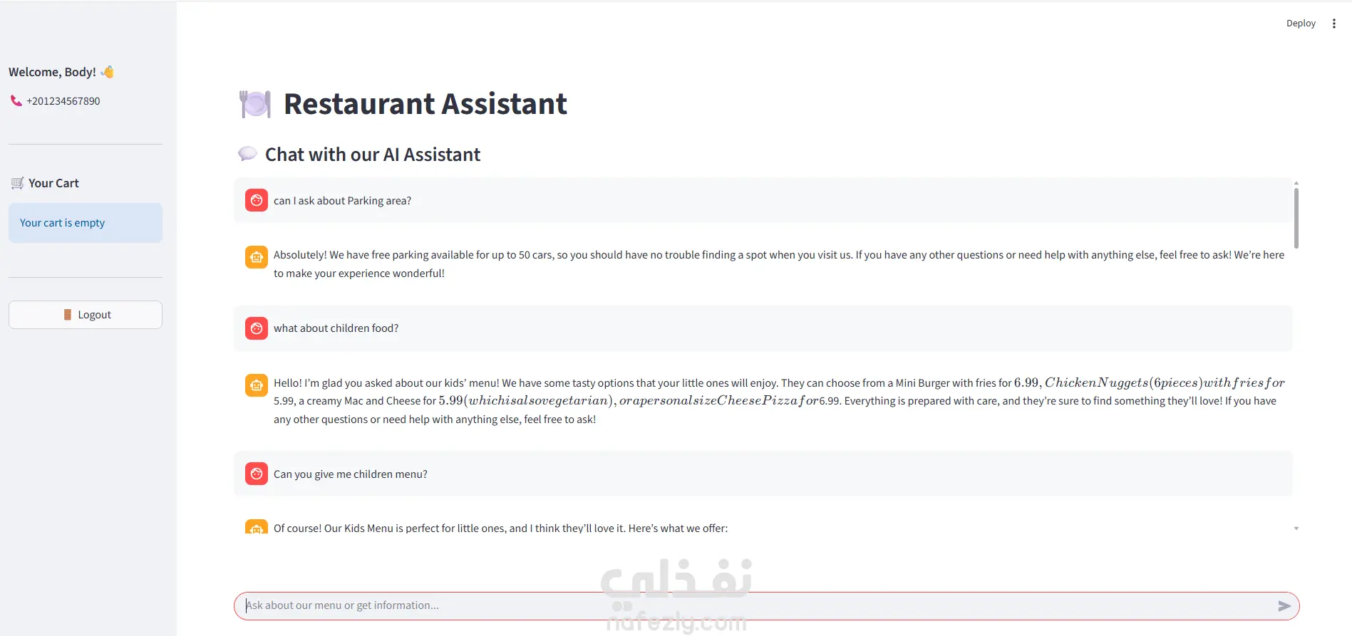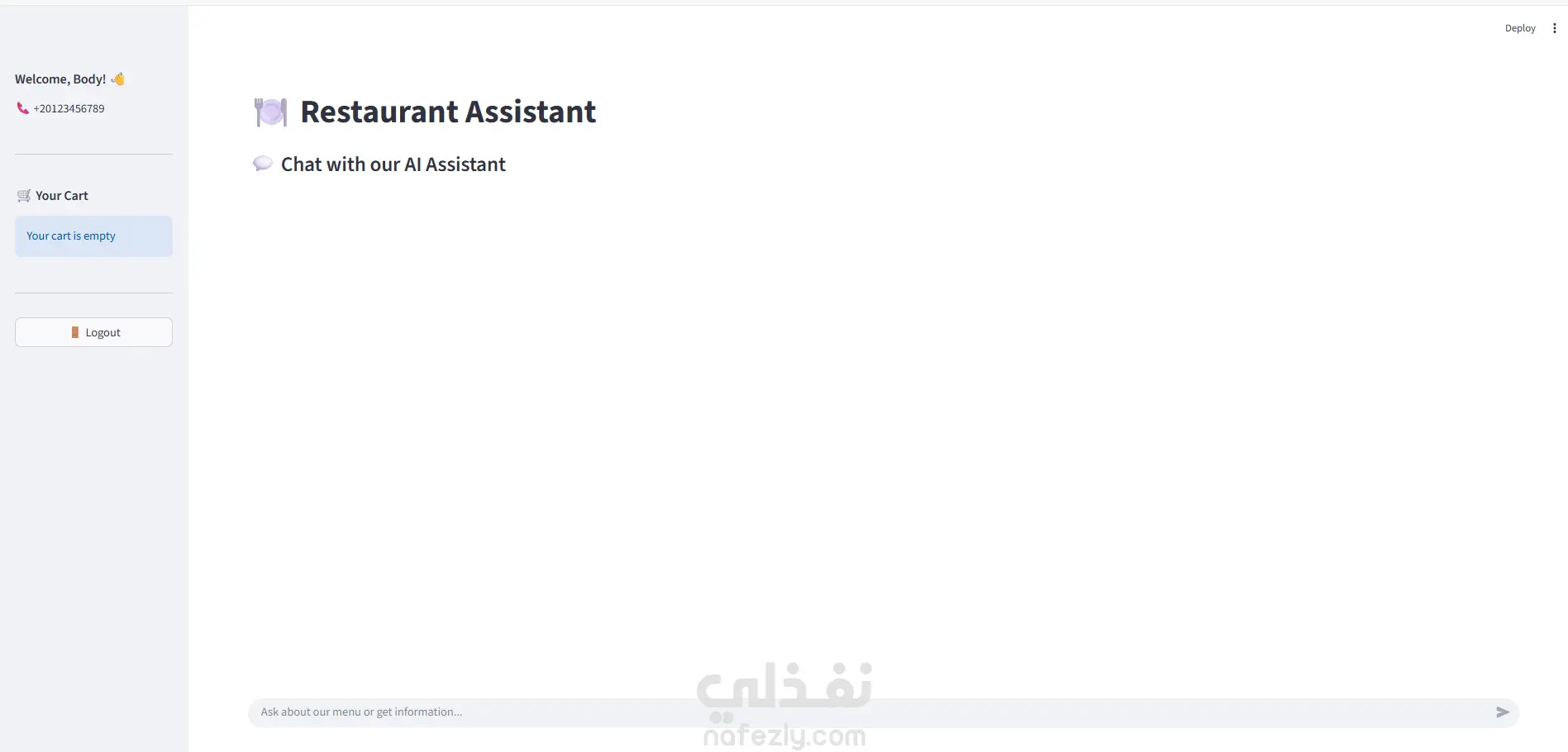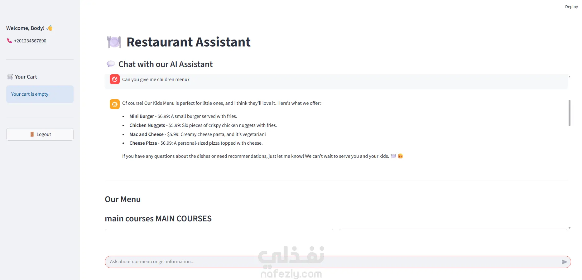 Restaurant AI Assistant, a smart chatbot that helps users with restaurant-related queries: booking tables, parking info, health & safety guidelines, browsing the menu, and placing orders. It also sends WhatsApp messages to customers when an order is placed and when it's ready.