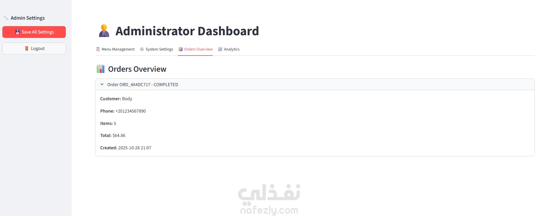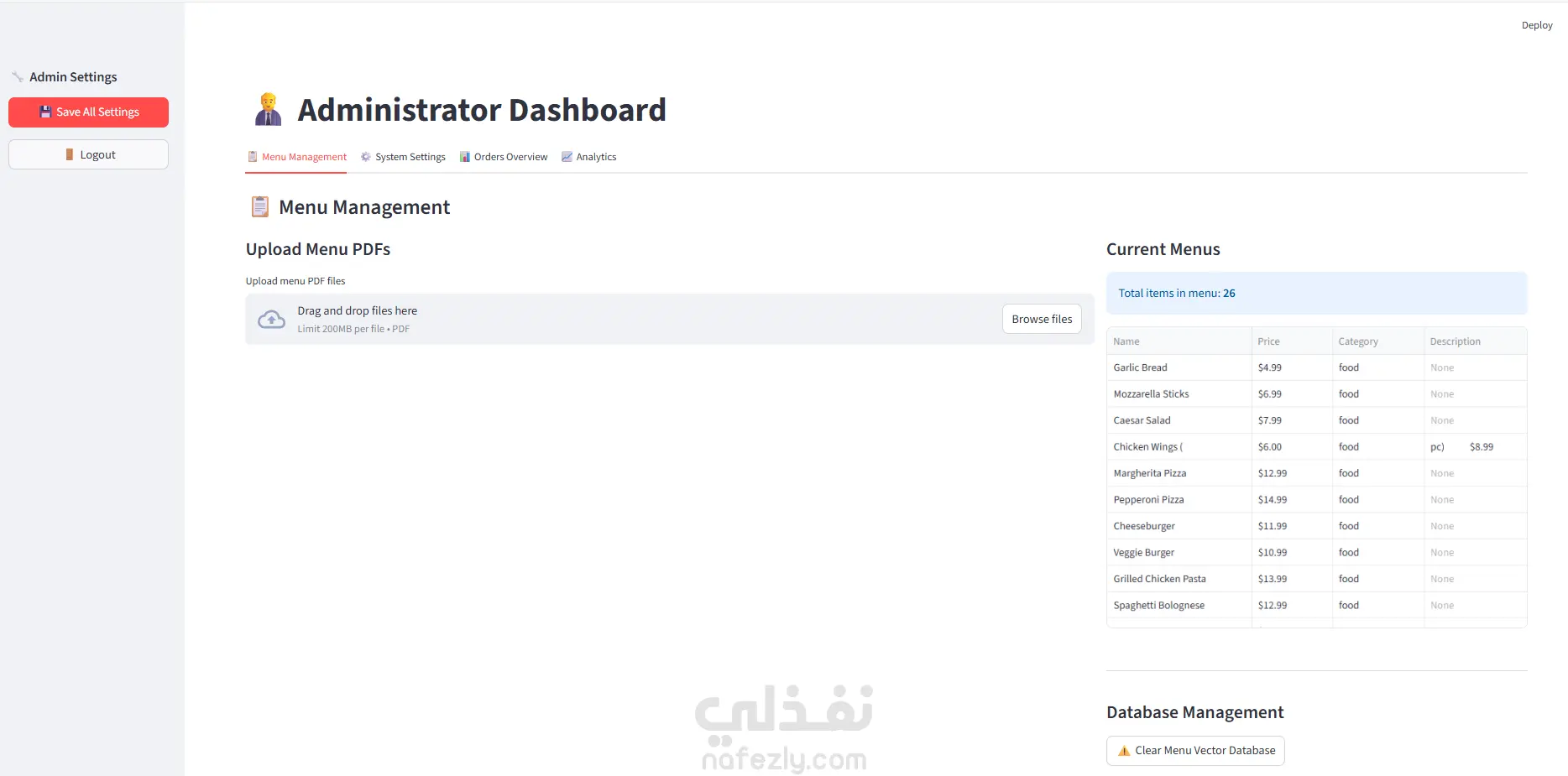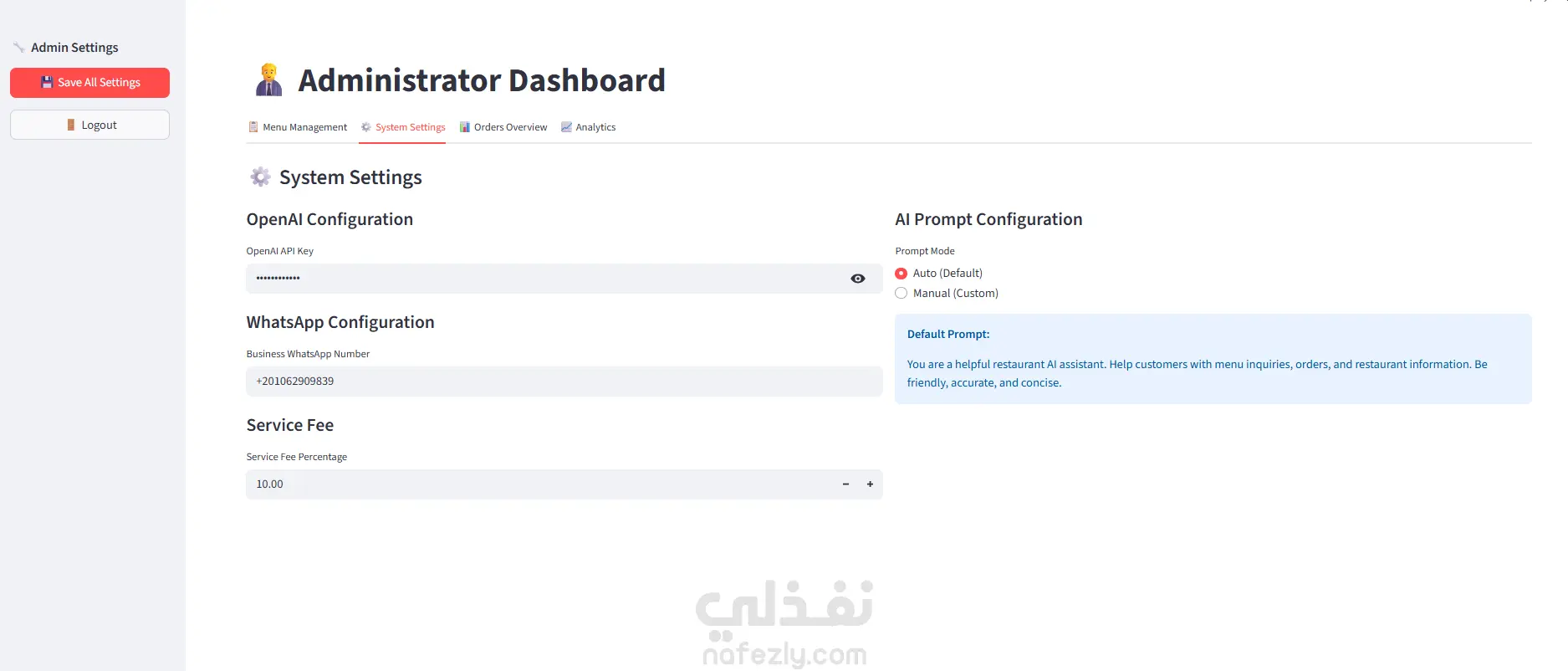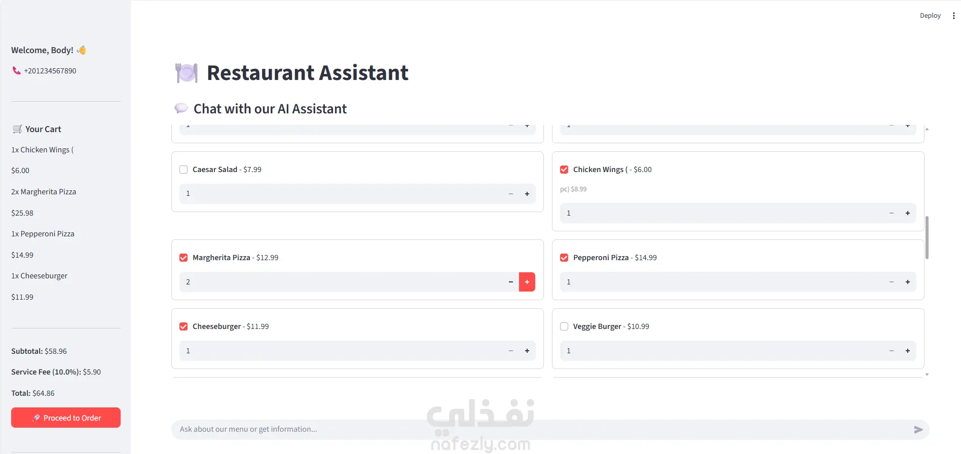 Restaurant AI Assistant, a smart chatbot that helps users with restaurant-related queries: booking tables, parking info, health & safety guidelines, browsing the menu, and placing orders. It also sends WhatsApp messages to customers when an order is placed and when it's ready.