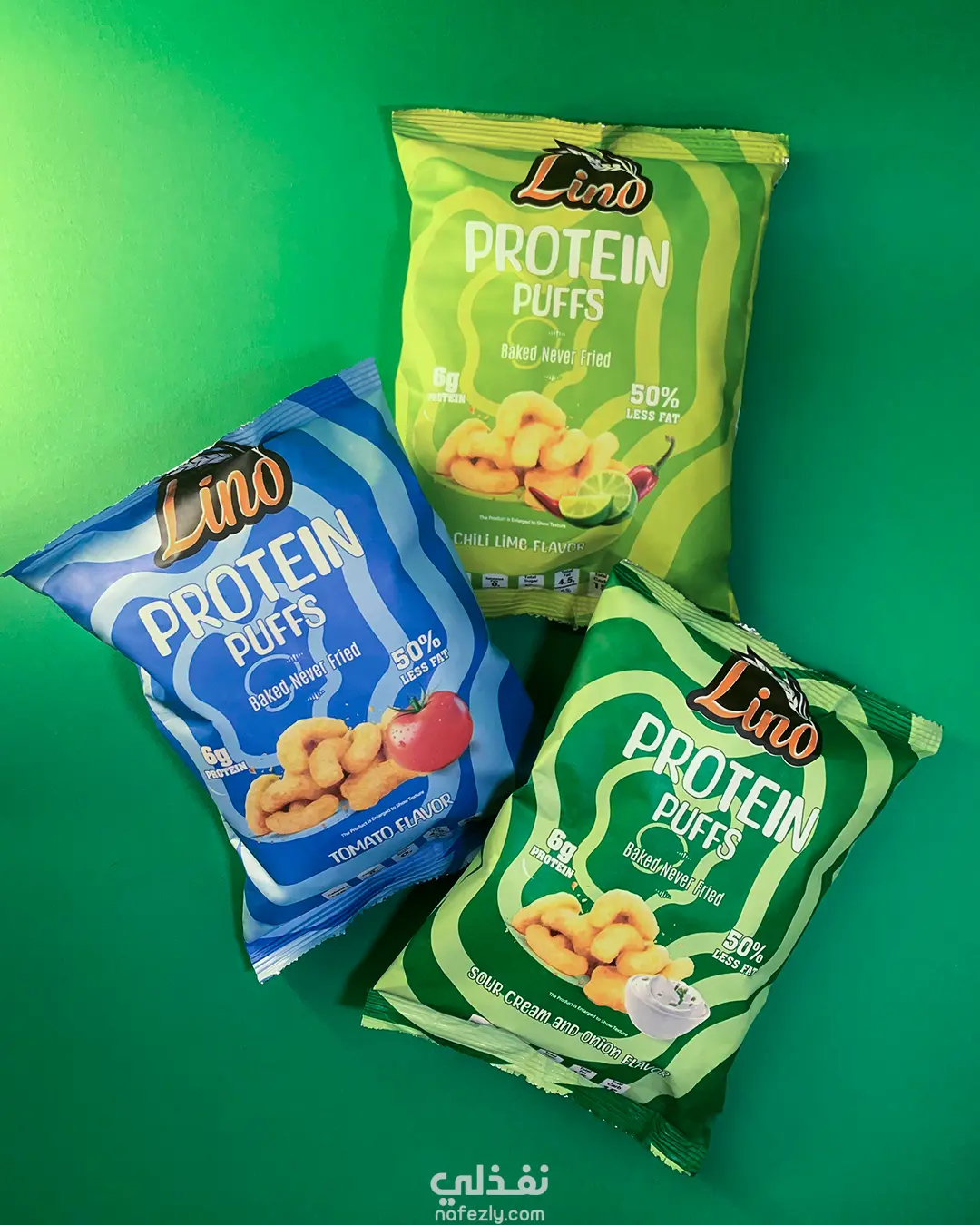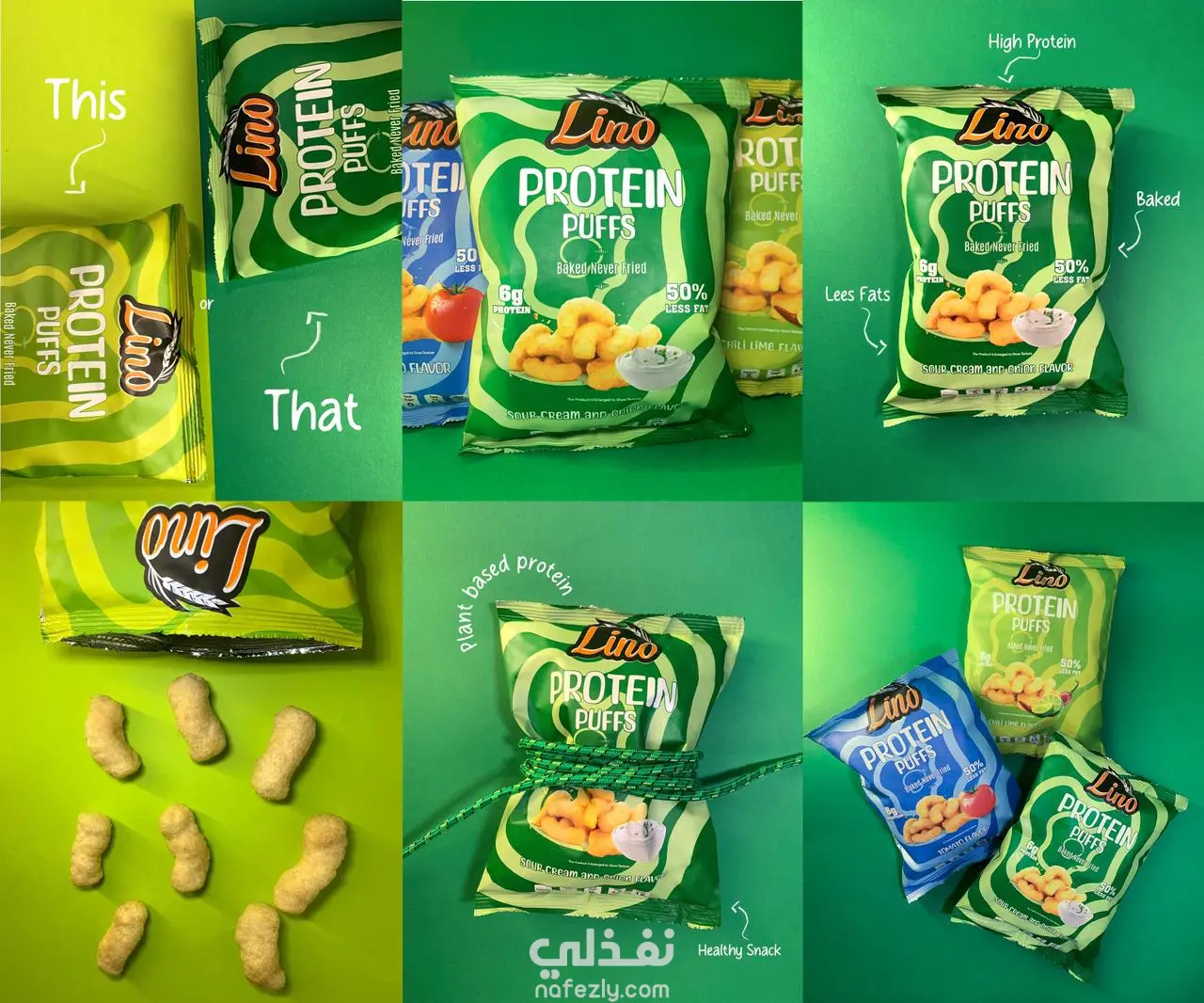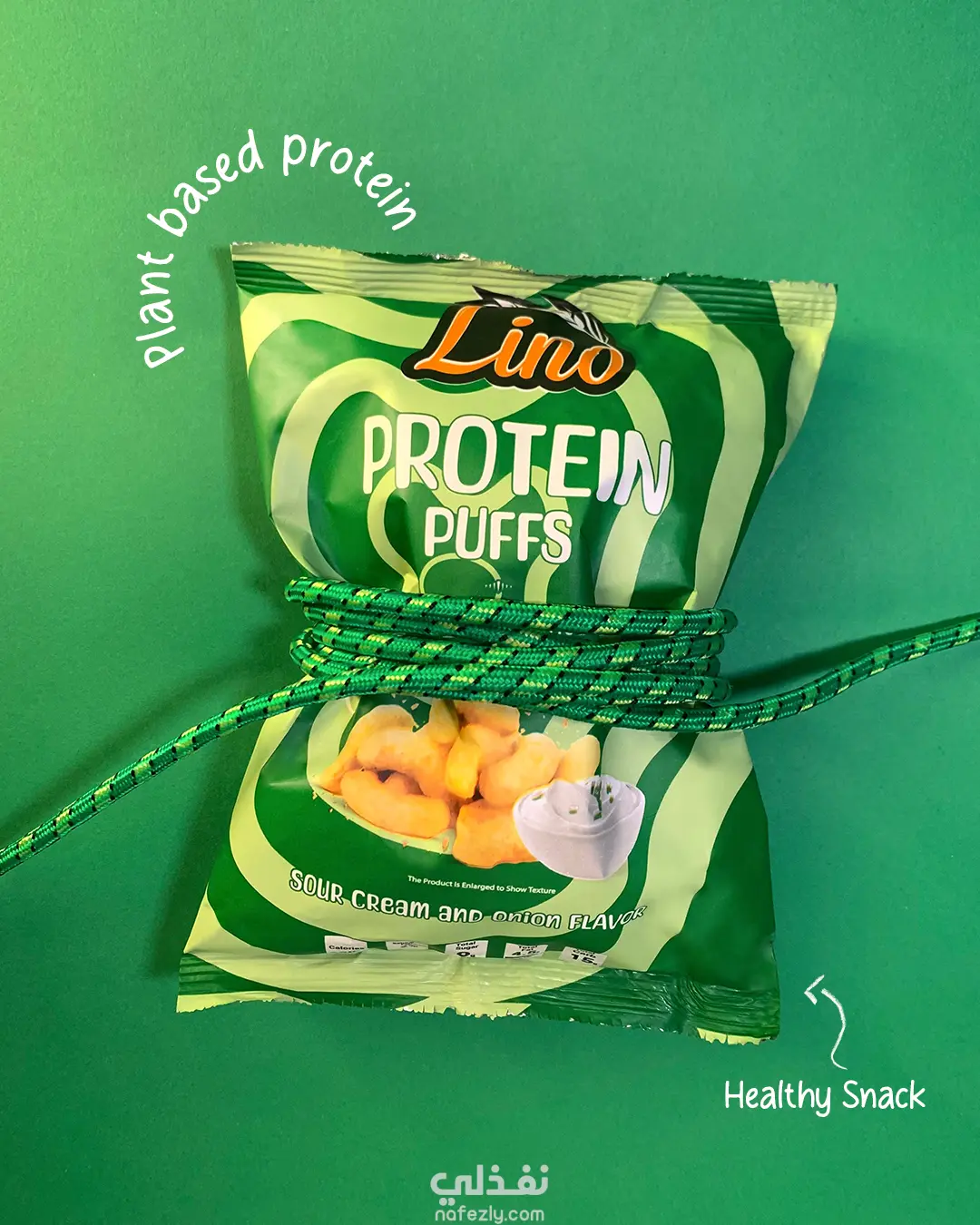 تصوير وتنسيق منتج سناك بروتين (Lino Protein Puffs) – جلسة تصوير احترافية بأسلوب إعلاني