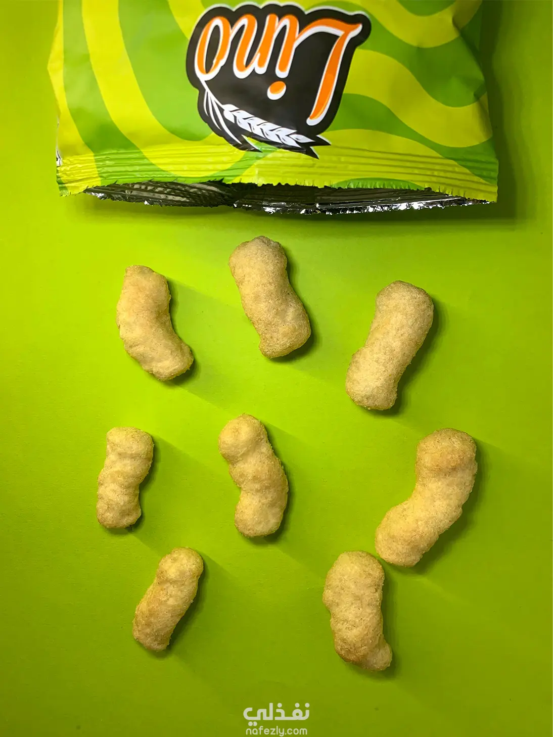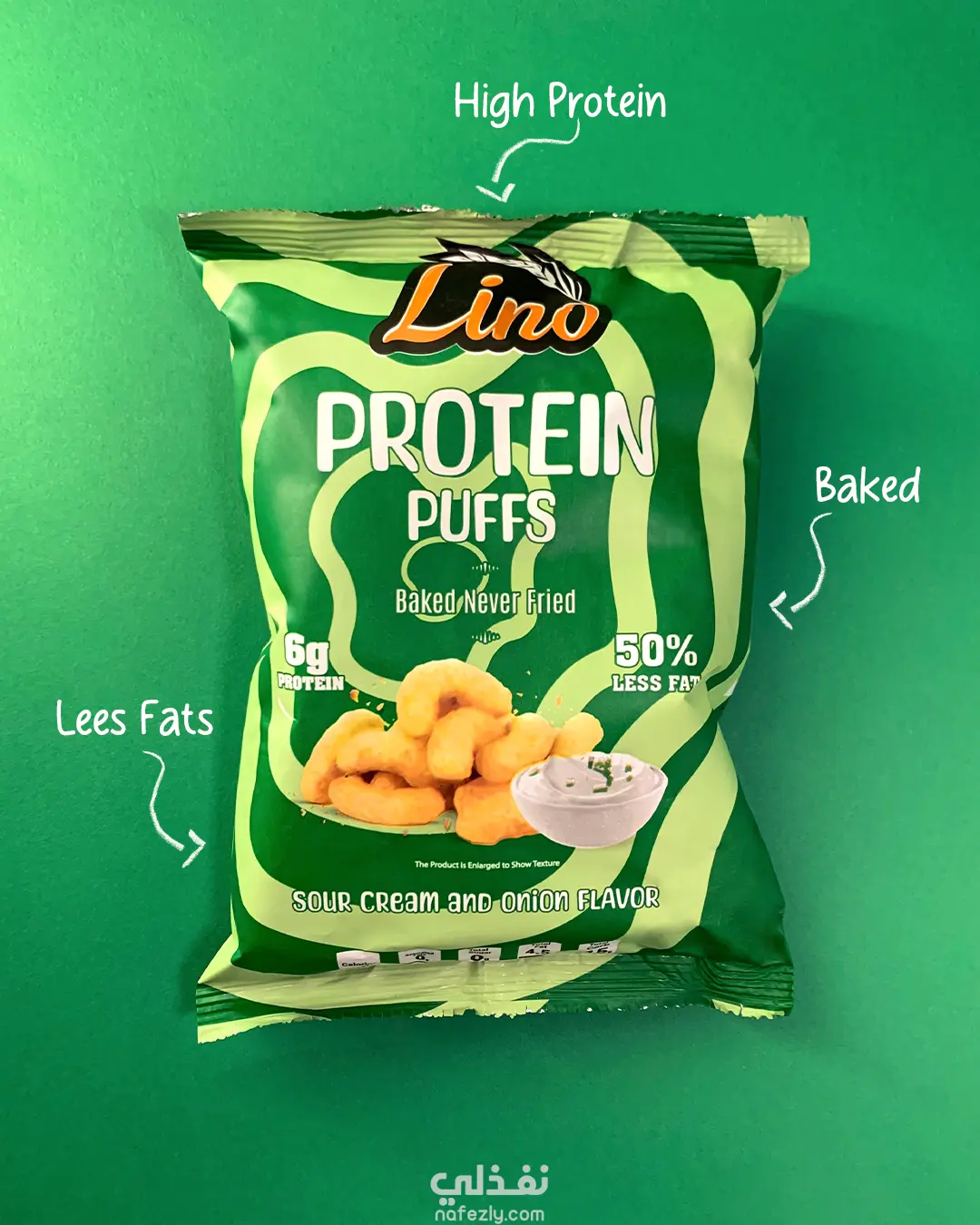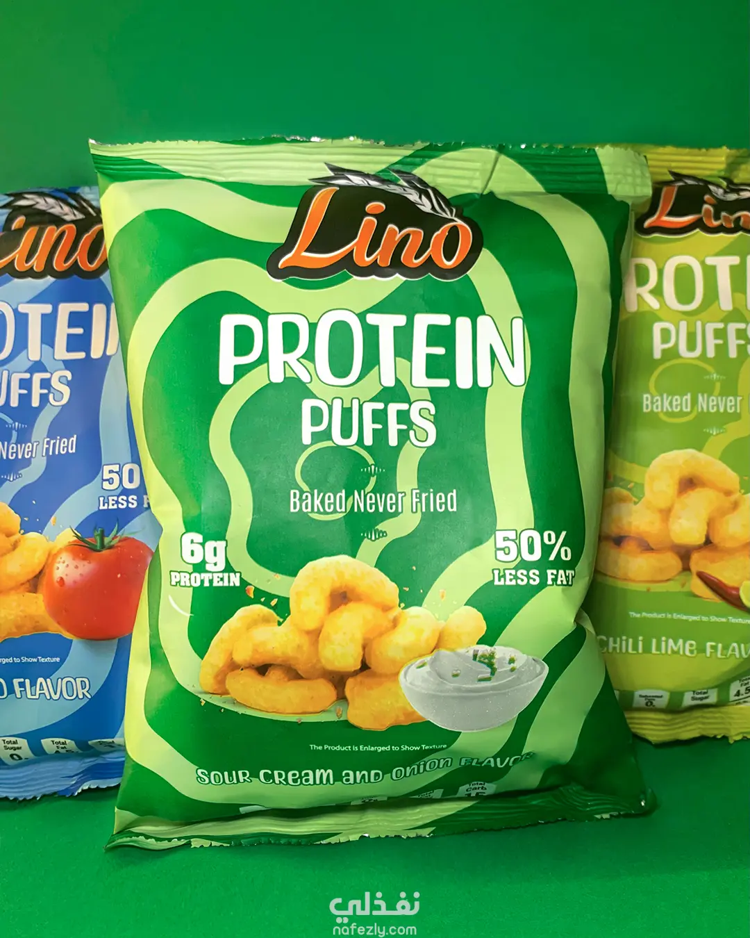 تصوير وتنسيق منتج سناك بروتين (Lino Protein Puffs) – جلسة تصوير احترافية بأسلوب إعلاني
