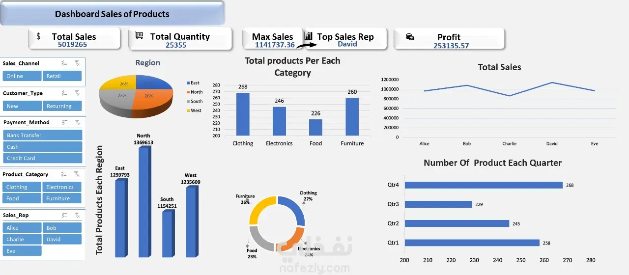 تم إنشاء لوحة تفاعلية لتحليل بيانات المبيعات تتضمن مؤشرات الأداء الرئيسية مثل إجمالي المبيعات، إجمالي الكمية، أعلى مبيعات، وأفضل مندوب مبيعات. كما تعرض اللوحة توزيع المبيعات حسب الفئة والمنطقة وطريقة الدفع والقنوات المختلفة (أونلاين/تجزئة). تم تصميمها لتسهيل اتخاذ القرارات وتحليل أداء المبيعات بشكل بصري وفعّال.
