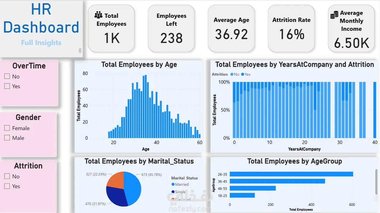 لقد قمت بتحليل بيانات الموظفين بشكل احترافي باستخدام أدوات Power BI المتقدمة. تضمنت العملية تنظيف ومعالجة البيانات عبر Power Query لضمان دقة المعلومات وجاهزيتها للتحليل، ثم تصميم لوحات معلومات تفاعلية وتقارير تفصيلية تسلط الضوء على: مؤشرات الأداء الرئيسية (KPIs) مثل عدد الموظفين، معدل دوران الموظفين (Attrition Rate)، ومتوسط الدخل الشهري. تحليل يشمل توزيع الموظفين حسب العمر، الجنس، الحالة الاجتماعية، وسنوات الخدمة. تحليل عميق لتحديد العوامل المؤثرة في ترك العمل وتحسين سياسات الاحتفاظ بالموظفين. داش بورد تفاعلي يسهل على إدارة الموارد البشرية (HR) استكشاف البيانات واستخلاص الرؤى بسرعة وفعالية.