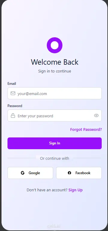 شاشة تسجيل الدخول (Login Screen): واجهة مستخدم نظيفة وسهلة الاستخدام، تحتوي على حقول للبريد الإلكتروني وكلمة المرور، مع خيار "نسيت كلمة المرور".
