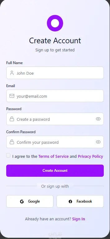 شاشة إنشاء حساب (Register Screen): فورم تسجيل حساب جديد يطلب من المستخدم إدخال البيانات الأساسية (مثل الاسم، البريد الإلكتروني، وكلمة المرور) مع مراعاة التحقق من صحة المدخلات.