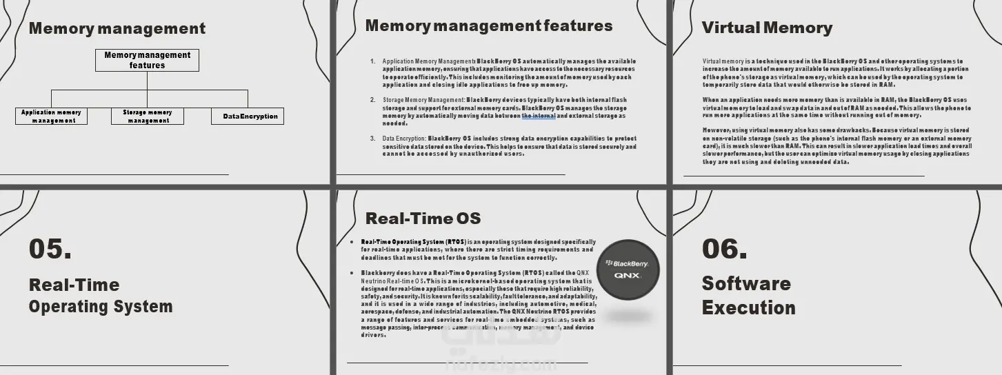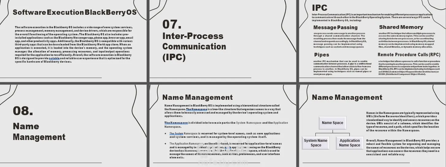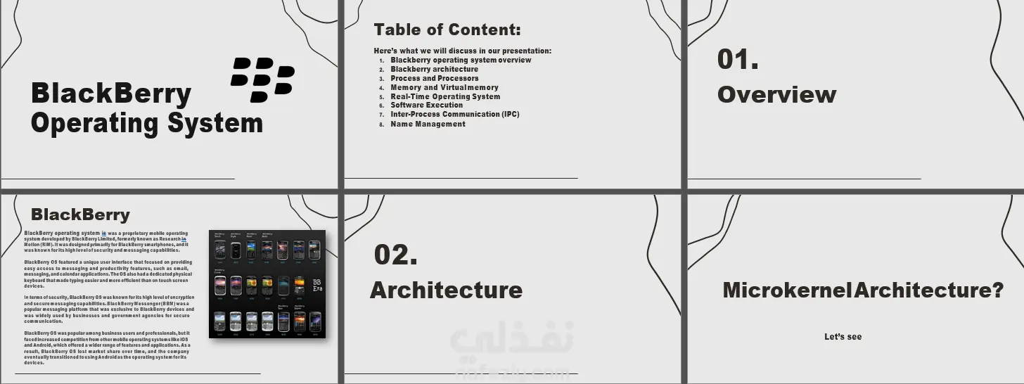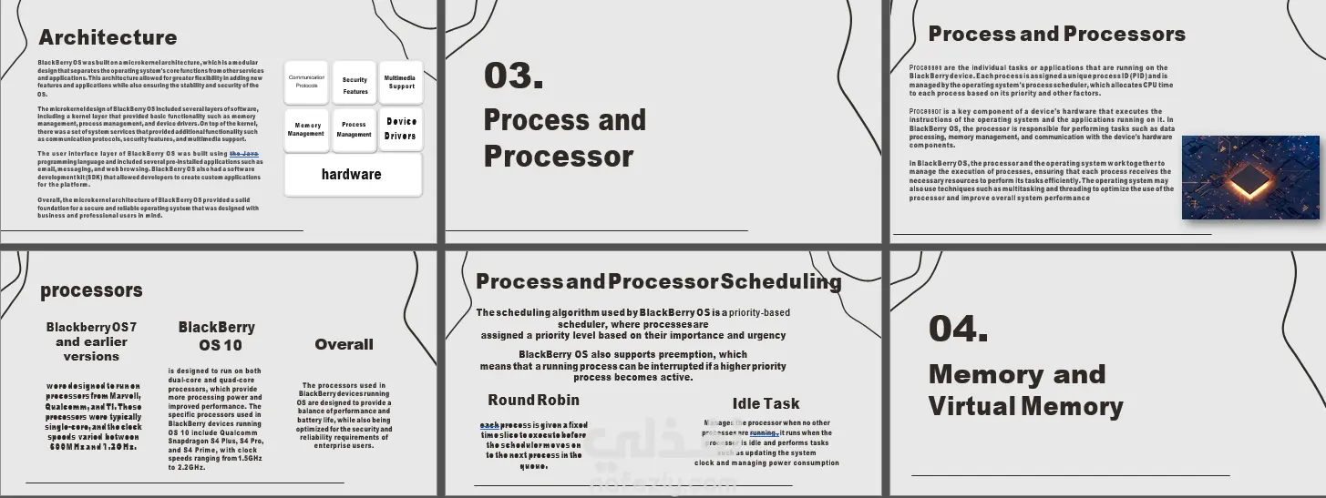 المحتويات الرئيسية: نظرة عامة: نظام تشغيل محمول آمن موجّه لرجال الأعمال والمحترفين. الهيكل: مبني على بنية النواة الصغيرة (Microkernel) لضمان المرونة والاستقرار. إدارة العمليات والمعالجات: يستخدم خوارزميات جدولة مثل الأولوية وتناوب الأدوار. الذاكرة: يدير الذاكرة العادية والافتراضية مع تشفير البيانات. نظام الوقت الحقيقي: يعتمد على نظام QNX Neutrino. التنفيذ والتواصل: شرح لكيفية تشغيل البرامج والتواصل بين العمليات (IPC). إدارة الأسماء: يستخدم هيكل Namespace لتنظيم الموارد. الهدف: تقديم فهم تقني عميق لنظام BlackBerry OS، مع إبراز نقاط قوته في الأمان والفاعلية وكيفية عمل مكوناته الداخلية.