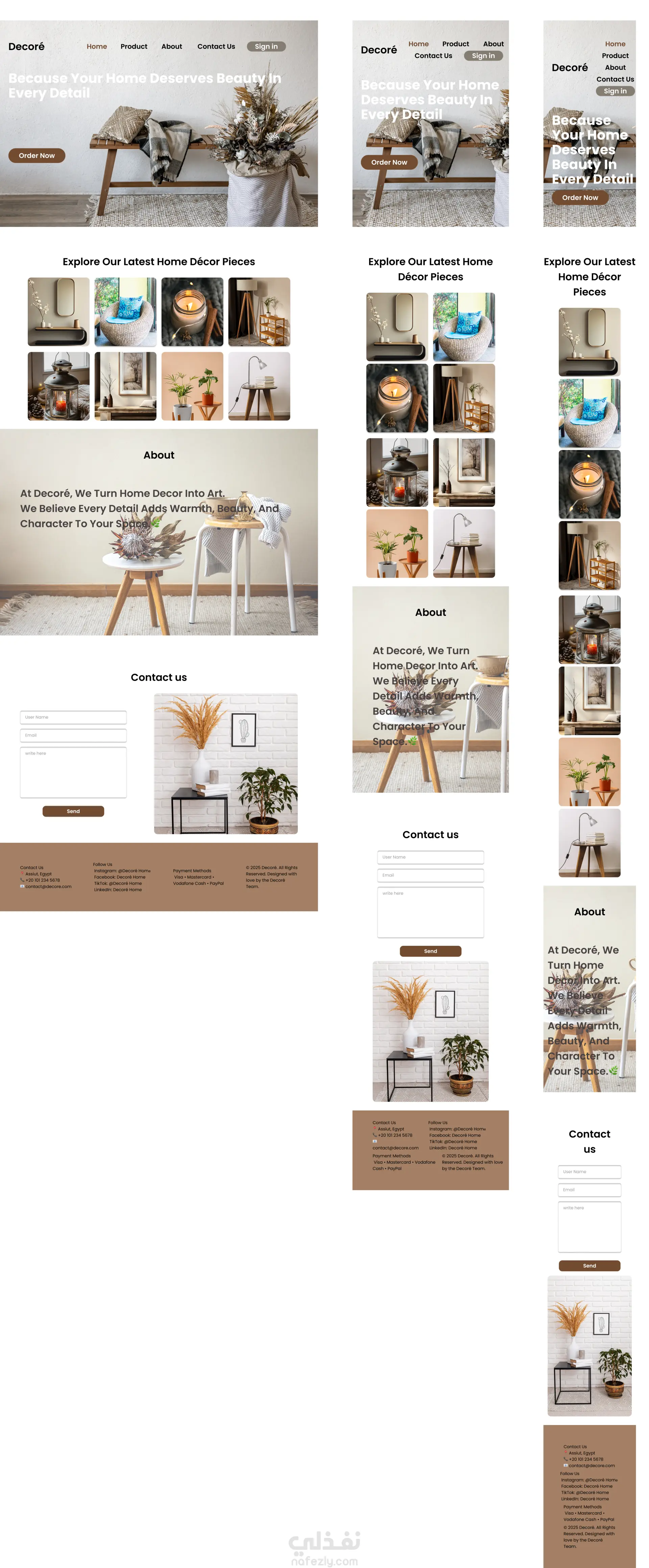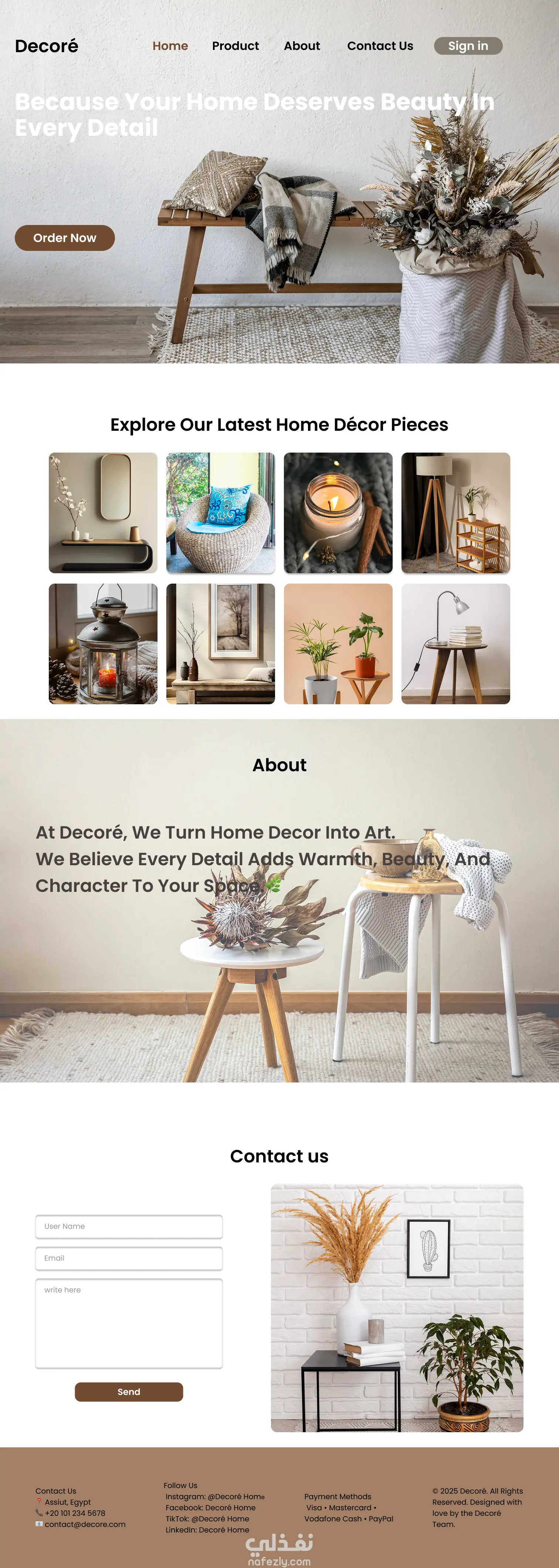 Decoré هو موقع إلكتروني (Landing Page) يختص بعرض وبيع منتجات الديكور المنزلي بطريقة أنيقة وبسيطة. يهدف التصميم إلى إبراز جمال القطع الديكورية من خلال واجهة هادئة وألوان دافئة تعكس إحساس الراحة والفخامة. تم تنفيذ التصميم باستخدام Figma مع مراعاة جعله متجاوبًا على جميع الأجهزة (كمبيوتر، تابلت، وموبايل) لتقديم تجربة مستخدم مريحة وسلسة.