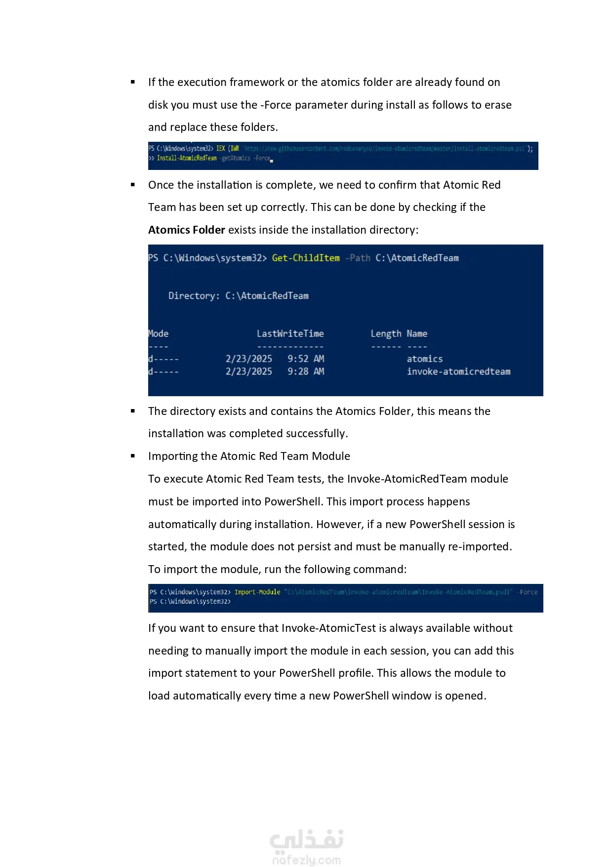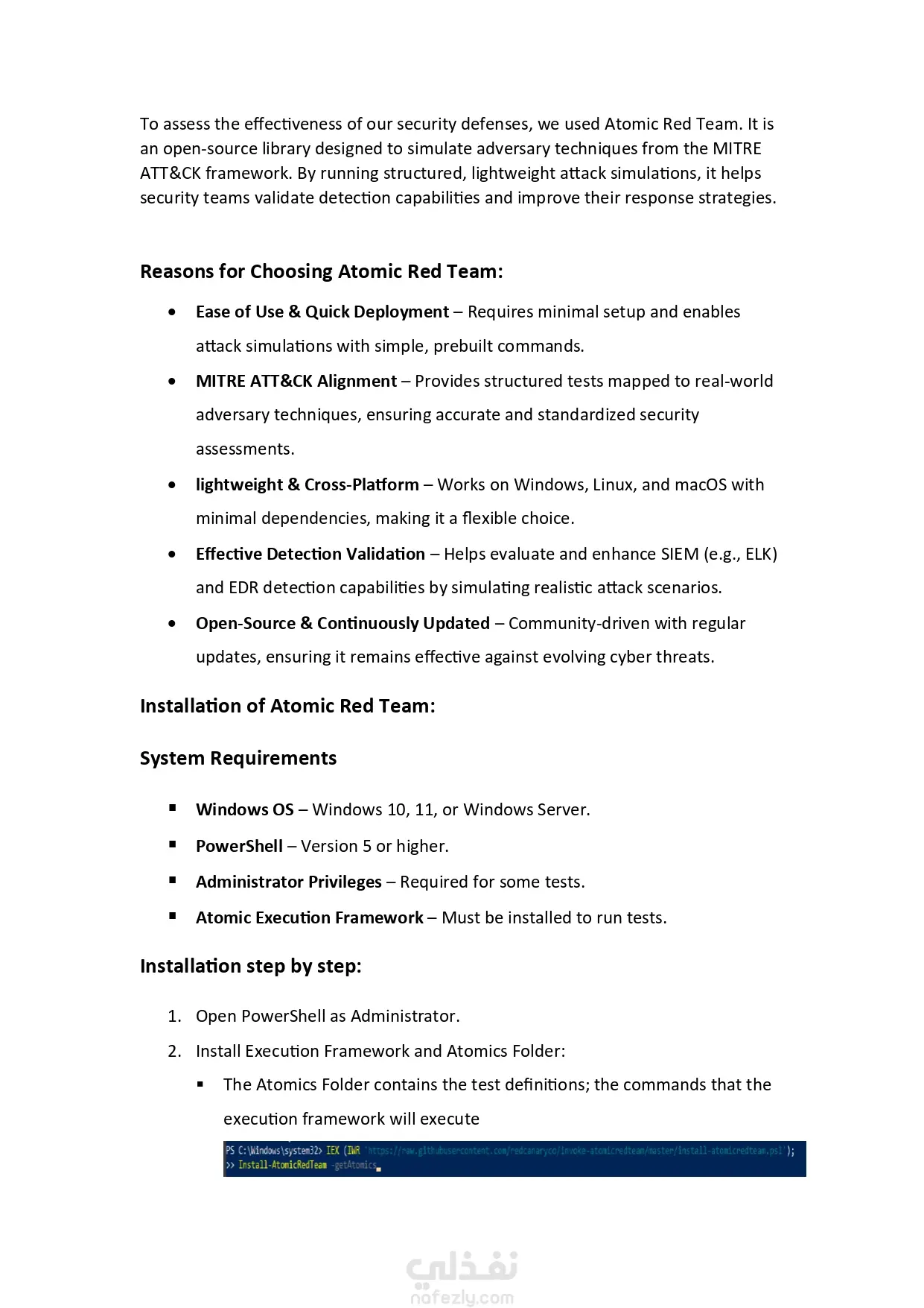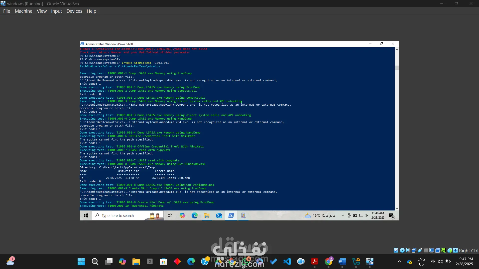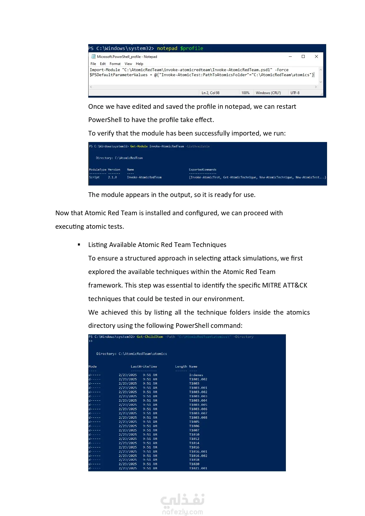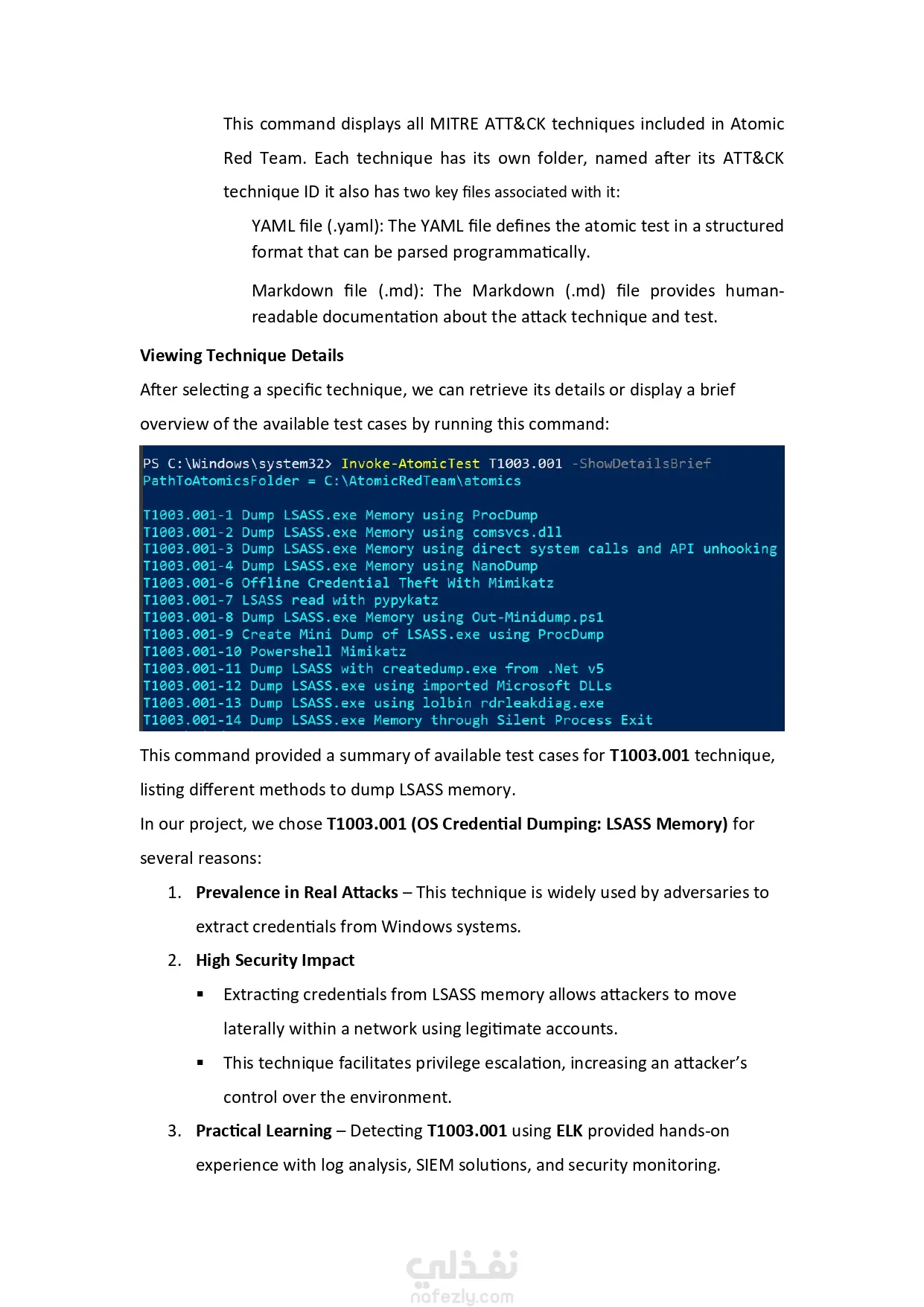شمل العمل: تثبيت الأداة وإعداد مجلدات atomics، استيراد وحدة Invoke-AtomicRedTeam في PowerShell، استعراض تقنيات ATT&CK المتاحة، وتشغيل حالات الاختبار المتوفرة للـ T1003.001.