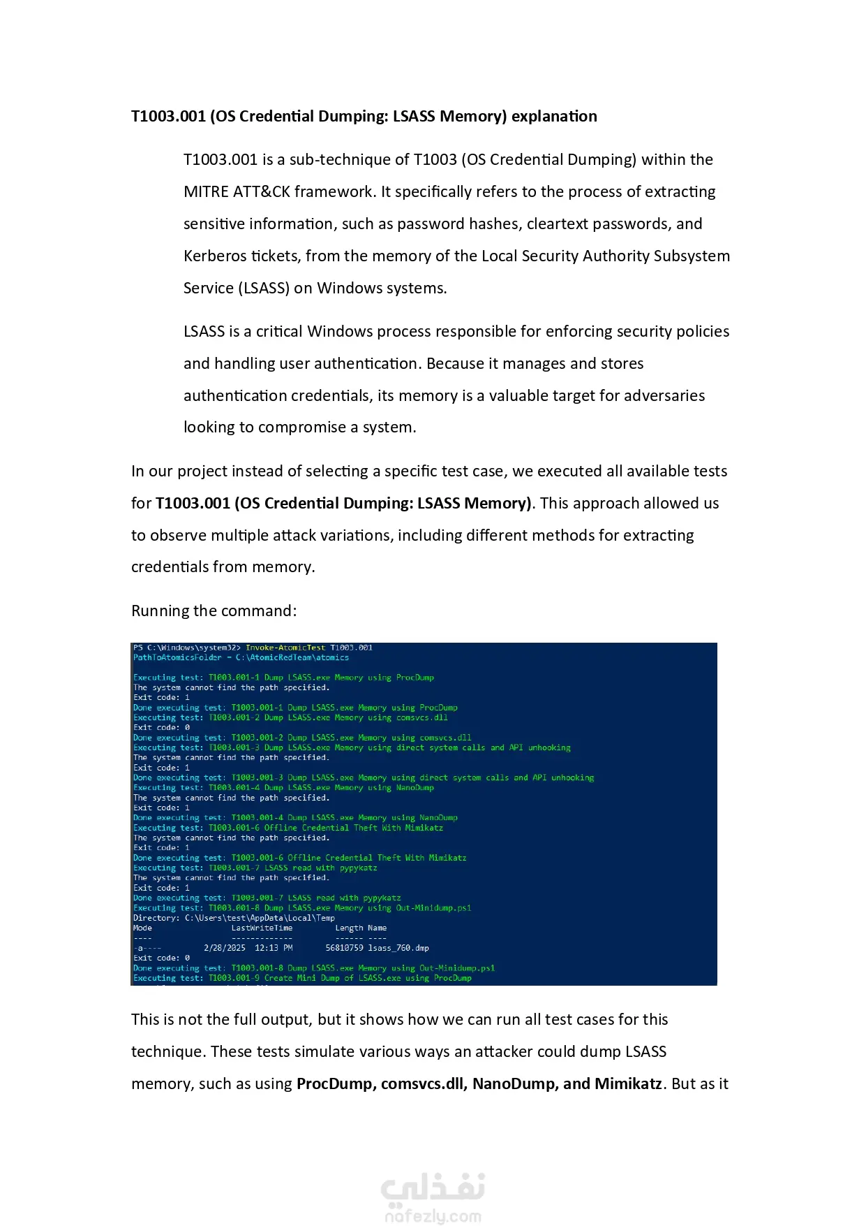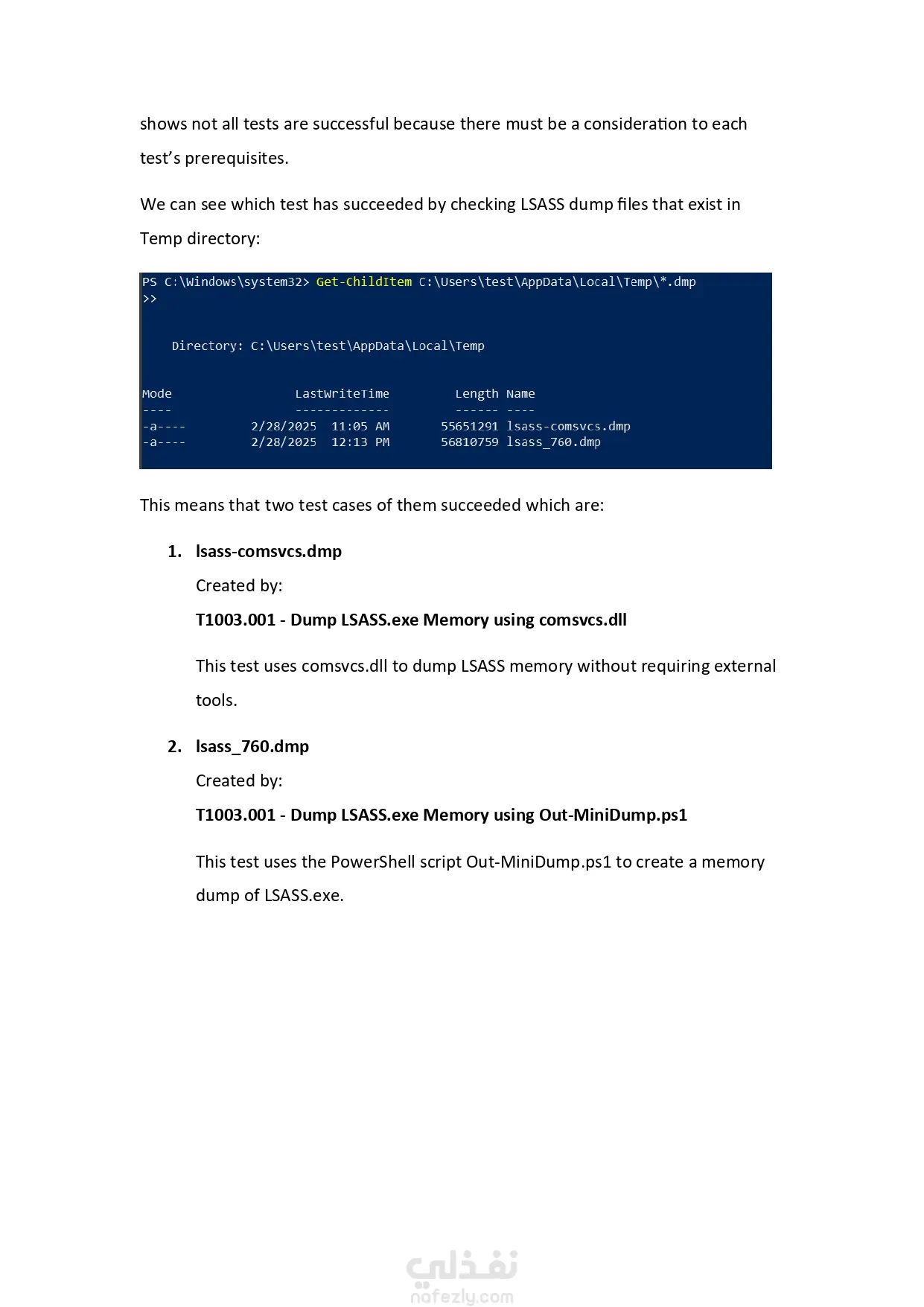 تم توثيق خطوات التنفيذ عمليًا (أوامر PowerShell، مسارات الملفات)، وتوثيق النتائج الجزئية مثل وجود ملفات dump الناجحة (lsass-comsvcs.dmp وlsass_760.dmp).