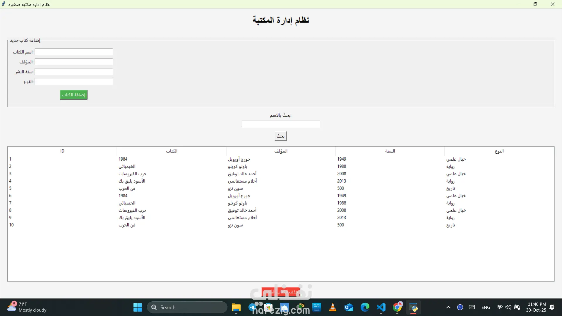 # نظام إدارة مكتبة صغيرة نظام بسيط لإدارة كتب المكتبة مع واجهة رسومية. ## المميزات - إضافة كتب - عرض الكتب - بحث بالاسم - حذف كتاب - 5 كتب جاهزة عند التشغيل - حفظ البيانات في SQLite ## التقنيات - Python - SQLite - Tkinter ## طريقة التشغيل ```bash python library.py
