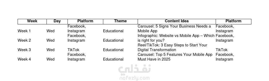 العمل عباره عن خطه محتوي لمده شهرين لشركه تعمل في تصميم المواقع الالكترونيه وتطبيقات الموبيل في مصر والسعوديه علي مواقع التواصل الاجتماعي (facebook , instgram and tiktok) بمحتوي رسمي ولغه بيضاء تناسب الجمهور المستهدف من اصحاب الشركات