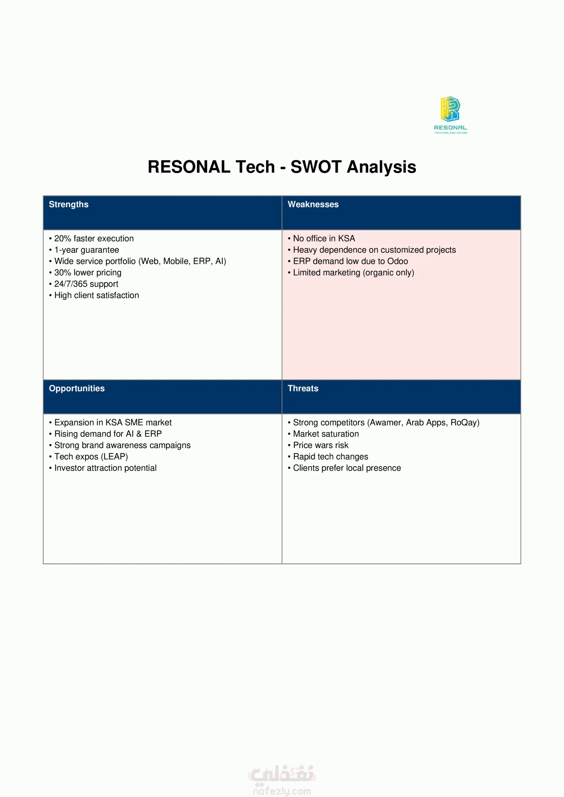 استراتيجيه محتوي كامله لشركه برمجيات متخصصه في تصميم المواقع الالكترونيه والتطبيقات 1- تحليل SWOT يوضح نقاط القوة والضعف والفرص والتهديدات الخاصه بعملك في سوق العمل 2- تحليل المنافسين لاكتشاف أساليبهم ونقاط تفوقهم وضعفهم في سوق العمل والاستفاده من هذه النقاط لتطوير عملك 3- تحديد منصات التواصل الاجتماعي الأنسب لعلامتك التجارية بناءً على طبيعة جمهورك المستهدف 4- بناء خطه محتوى توضح الأهداف التسويقيه وافكار ونغمه المحتوى التى تتوافق مع عملك وجمهورك المستهدف 5- خطة محتوى جاهزة للنشر تشمل أفكارمحتوي وصياغة مبدئية لهذه الافكار ومنصات التواصل الاجتماعي التى ستنشر عليها 6- نبرة صوت العلامة (TOV) لتوحيد أسلوب التواصل عبر المنصات 7- محتوي شهري جاهز للنشر مباشره علي مواقع التواصل الاجتماعي هذه الخدمة مناسبة لـ: المشاريع الناشئة والمتاجر الإلكترونية المسوقين ومديري السوشيال ميديا المستقلين الراغبين في تطوير هويتهم الرقمية محتوى بدون استراتيجية = مجهود ضائع. دعنا نحول فكرتك إلى خطة محتوى تحقق نتائج حقيقي ما الذي سيستلمه العميل ستستلم 1- ملف pdf لSWOT Analysis يوضع نقاط القوه والضعف والفرص والتهديدات التي تواجه عملك 2- ملف pdf لتحليل 3 منافسيين مباشرين لنقاط القوه والضعف لديهم وتحليل موقعهم الالكتروني وكذلك منصات التواصل الاجتماعي لديهم 3- ملف excel يحتوي علي خطه المحتوي الشهري التي تتضمن 12 فكره مع كل فكره منصات التواصل الاجتماعي المناسبه لها مع تحديد نغمه المحتوي TOV مع افكار لمصصم الجرافك 4- ملف وور بكل فكره في خطه المحتوي مع محتوي جاهز للنشر مباشره علي مواقع التواصل الاجتماعي المناسبه للعمل الخاص بك