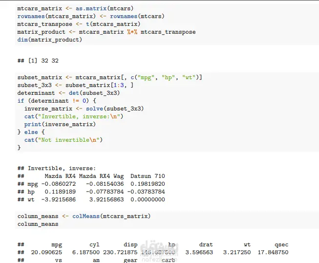 This project analyzes the mtcars dataset (32 cars, 11 variables like MPG, hp, wt, am) to identify factors affecting fuel efficiency using matrix operations, exploratory analysis, regression, and visualizations. Data Analysis Matrix Operations We convert mtcars to a matrix, compute its transpose and product, check a 3x3 subset’s invertibility, and calculate column means