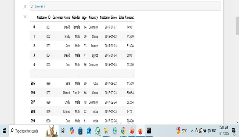 هذا المشروع يركز على تحليل بيانات العملاء والمبيعات باستخدام Python في بيئة Jupyter Notebook. تم استخدام مكتبات Pandas و NumPy لمعالجة البيانات وإجراء التحليلات الإحصائية. شمل المشروع الخطوات التالية: • استيراد البيانات وتحميلها للبدء في التحليل. • استخدام info() للحصول على نظرة عامة على البيانات، مثل نوع كل عمود وعدد القيم غير الفارغة. • إعادة تسمية الأعمدة لتسهيل التعامل مع البيانات. • التعامل مع القيم المكررة وحذفها لضمان دقة التحليل. • حذف القيم الفارغة (Dropna) لتحسين جودة البيانات. • تحليل إحصائي للبيانات باستخدام describe() للحصول على معلومات مثل المتوسط والانحراف المعياري والحدود القصوى والدنيا. • حساب عدد القيم الفريدة لكل عمود باستخدام nunique() لفهم تنوع العملاء والمنتجات. • تصدير البيانات النظيفة والمحسوبة إلى ملف CSV للاستخدام المستقبلي أو لمشاركة النتائج بسهولة. حجم الخدمة المقدمة عبارة عن 10 اعمدة يتم استخراج منهم المعلومات المطلوبة