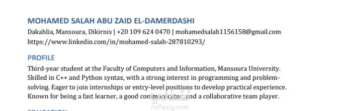 LinkedIn Profile احترافي يعرض خبراتك ومهاراتك بطريقة جذابة، أو سيرة ذاتية (CV) منظمة وجاهزة للتحميل بصيغة PDF نصائح لتحسين ظهورك على LinkedIn (لو اخترت الخدمة للـ LinkedIn)
