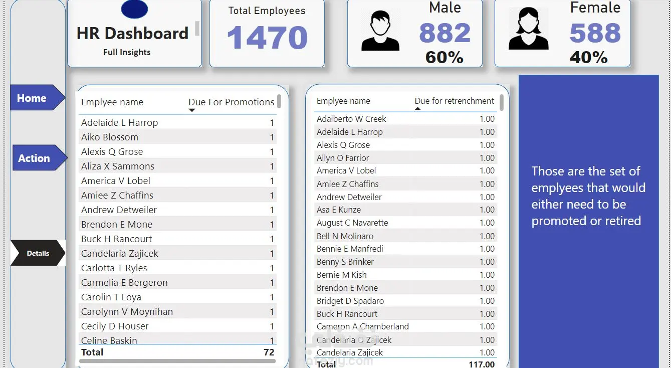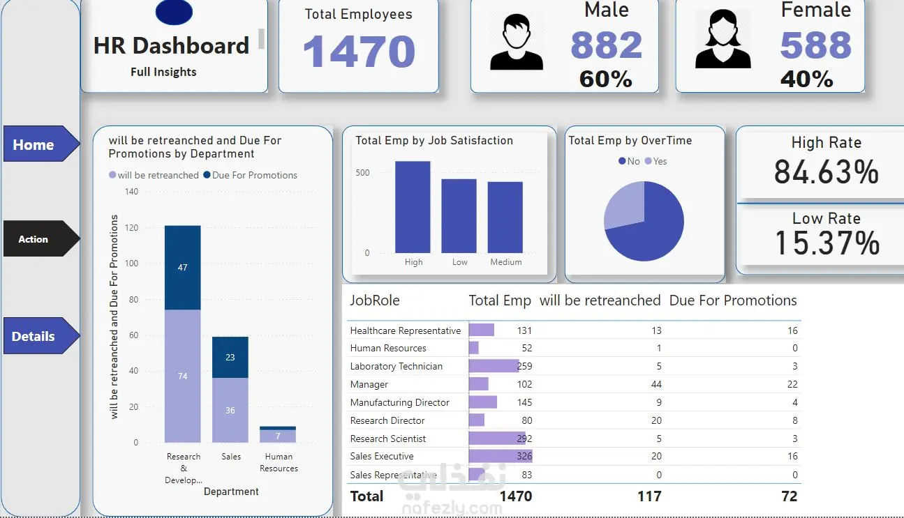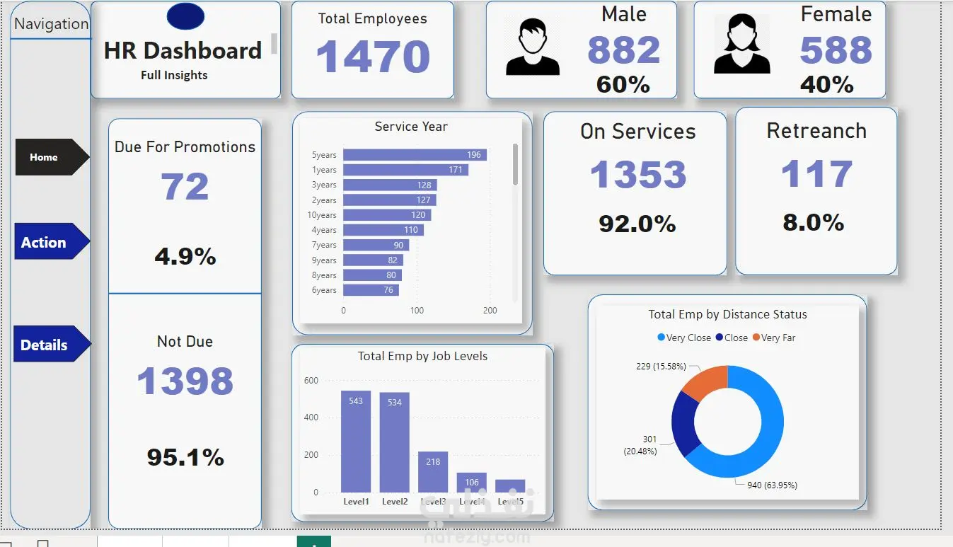 تقدم لوحة التحكم هذه نظرة شاملة على بيانات الموظفين لدعم قرارات الموارد البشرية. أبرز النقاط: إجمالي الموظفين الحالة الوظيفية الترقيات سنوات الخدمة المستويات الوظيفية البعد المكاني. توفر اللوحة رؤية واضحة لدعم الترقيات وتحسين إدارة الفريق.