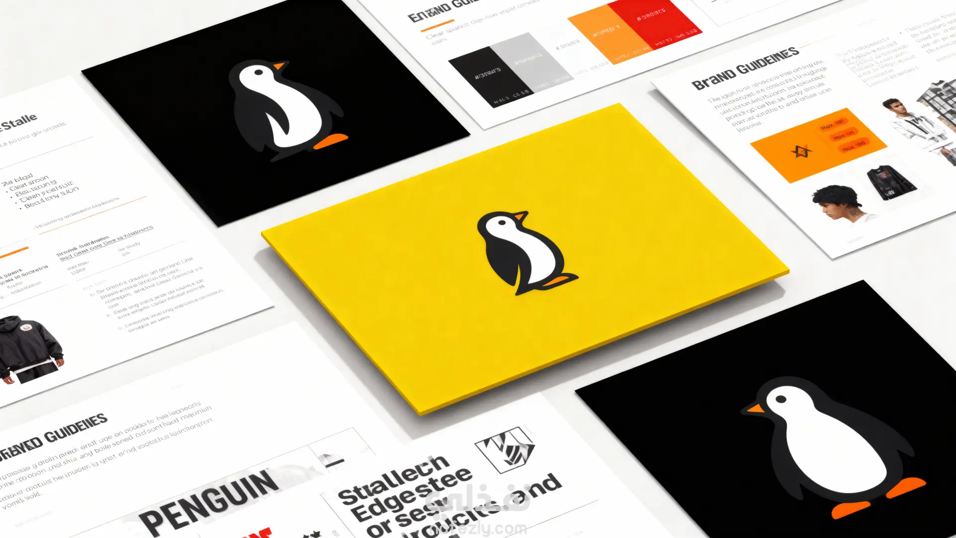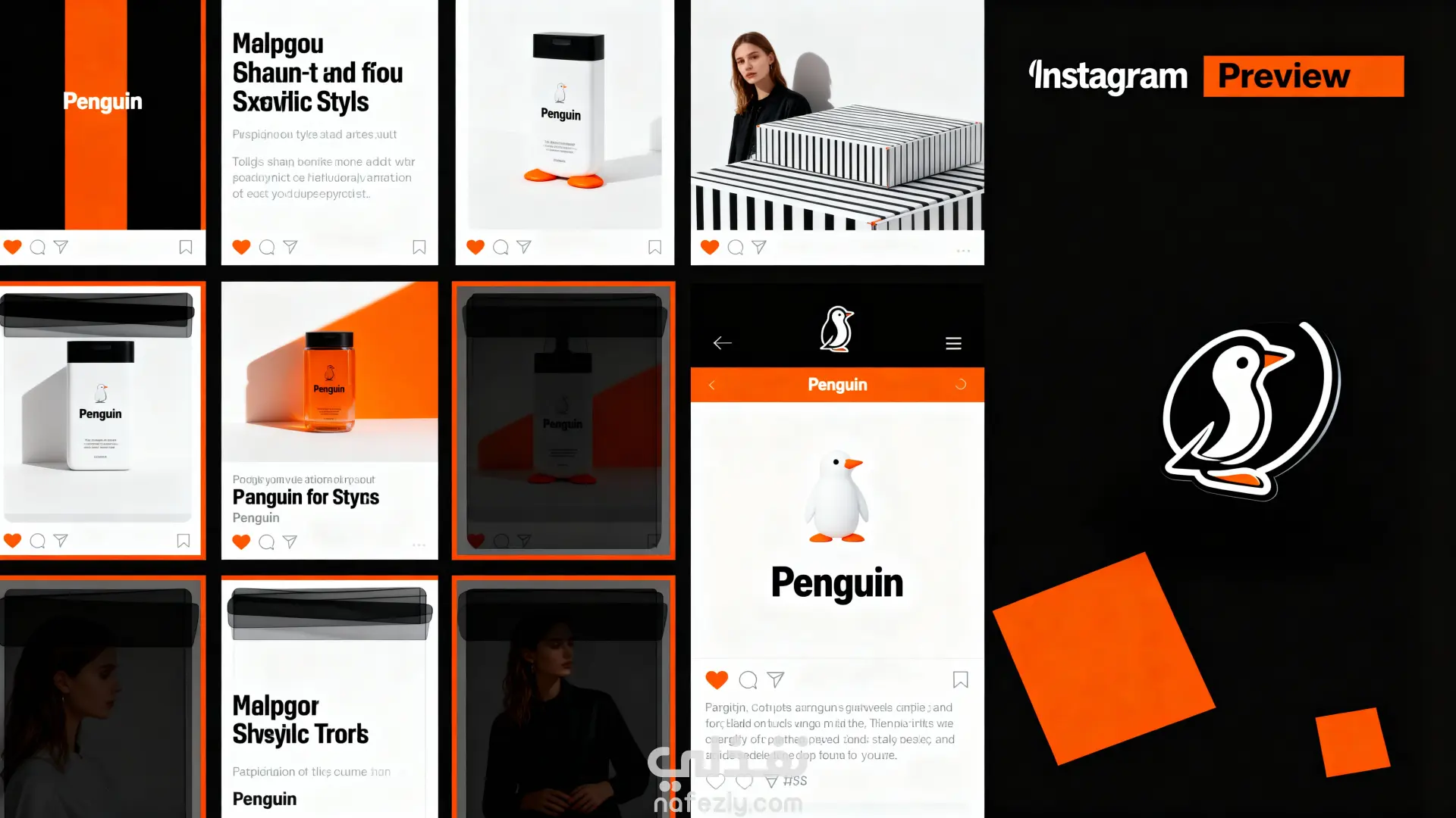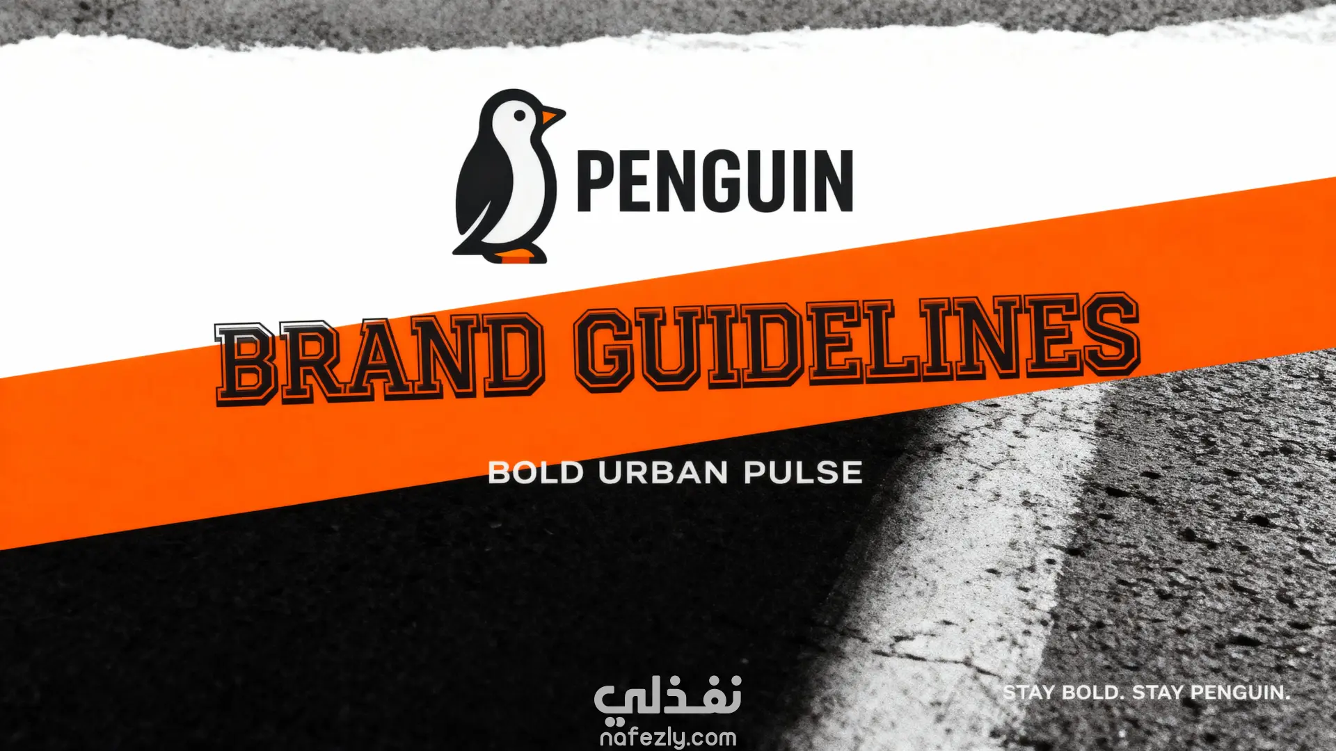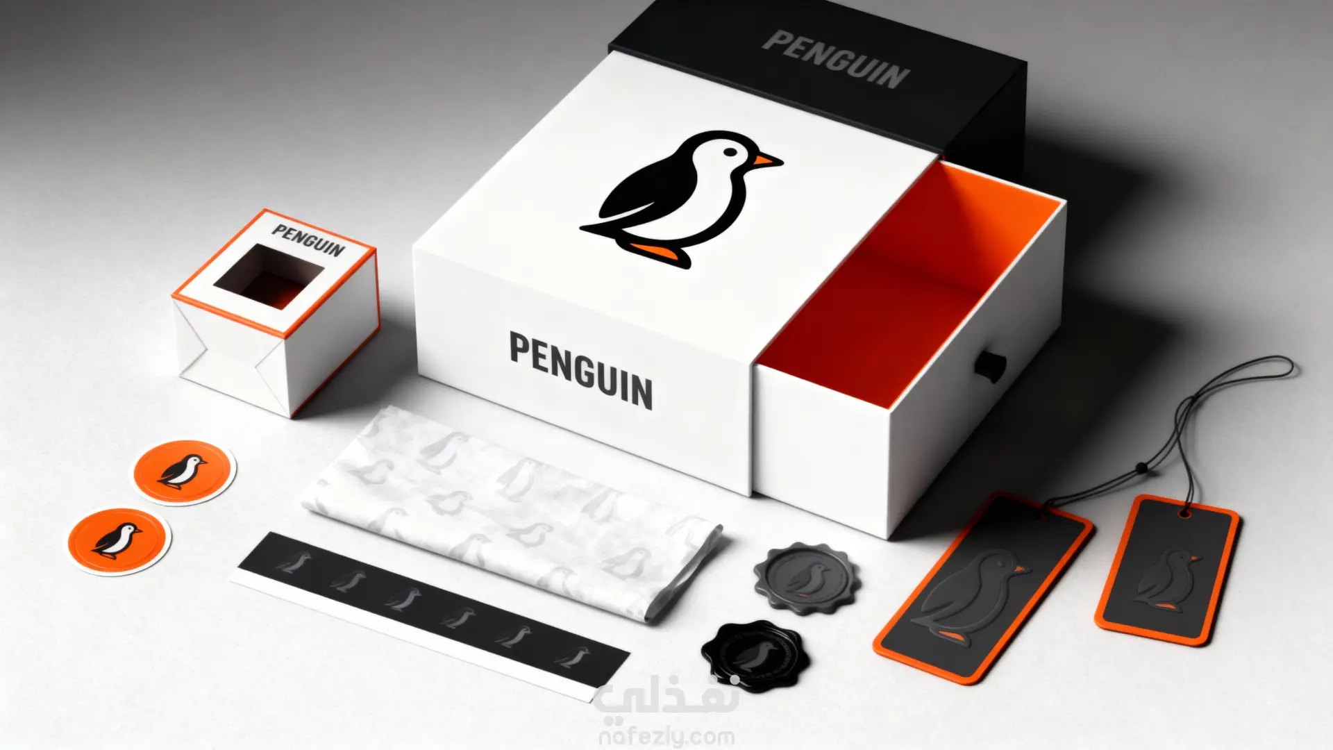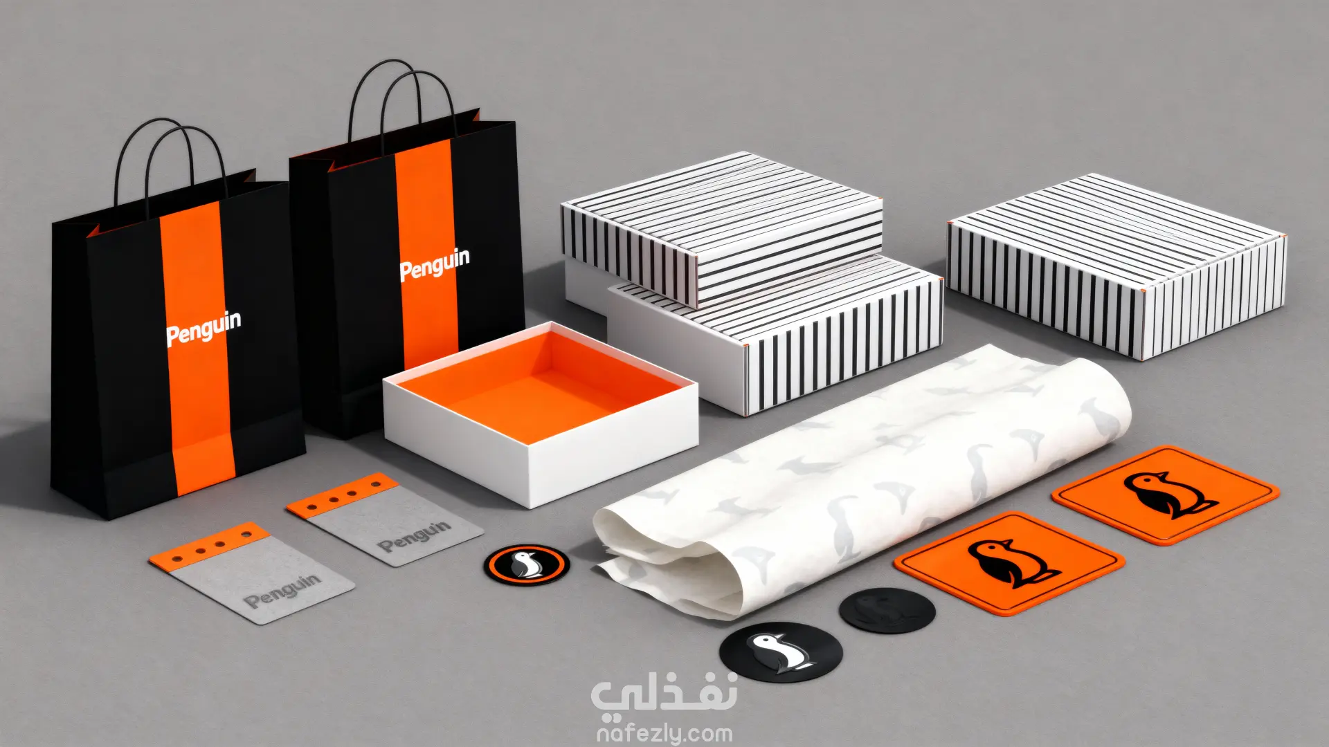 أما لوحة الألوان فجاءت بالأسود، الأبيض، والرمادي مع تفصيلة برتقالية مستوحاة من منقار البطريق، لتكون اللمسة الحيوية التي تميز الهوية البصرية للعلامة. هذه التوليفة تمنح الإحساس بالفخامة والوضوح في الوقت نفسه.