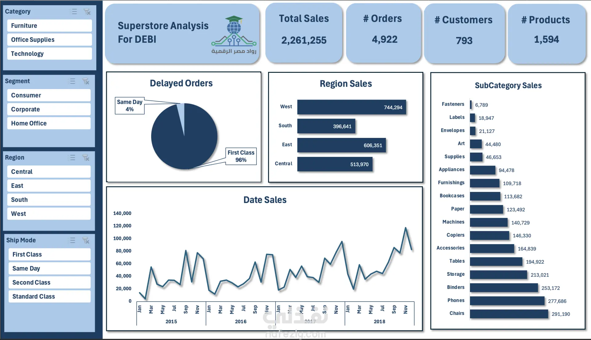 تم تطوير لوحة معلومات تفاعلية باستخدام برنامج Excel لتحليل بيانات المبيعات الخاصة بمتجر Superstore، ضمن مشروع تدريبي تابع لمبادرة رواد مصر الرقمية. يهدف المشروع إلى تقديم رؤية شاملة لأداء المبيعات عبر الفئات المختلفة، المناطق، وأنماط الشحن، مع تتبع الاتجاهات الزمنية وتحليل الطلبات المتأخرة.