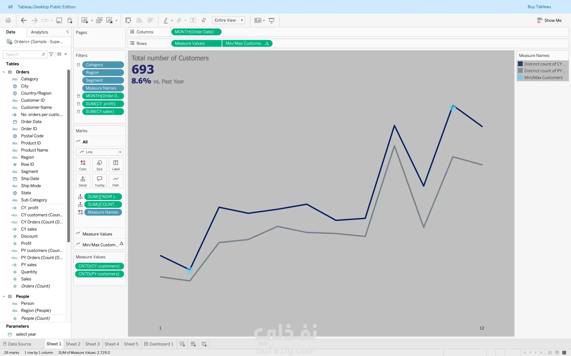 - تحليل زمني لاتجاهات عدد العملاء والمبيعات والطلبات على مدار العام