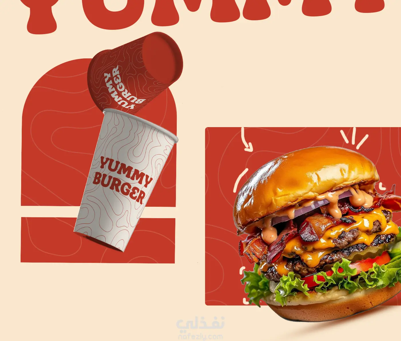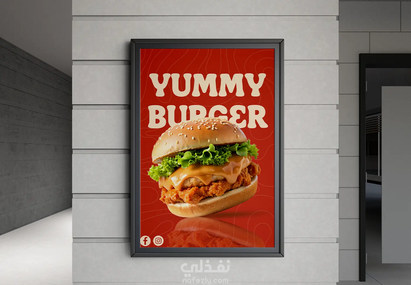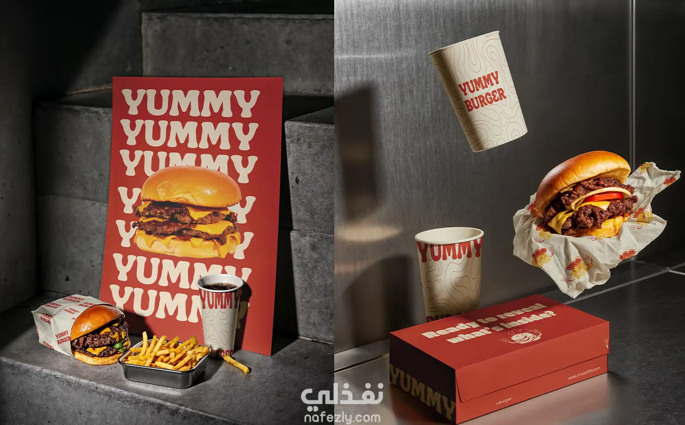 استخدمت ألوان دافئة وشهية مثل الأحمر والأصفر لإبراز روح الطعام السريع والمرح.