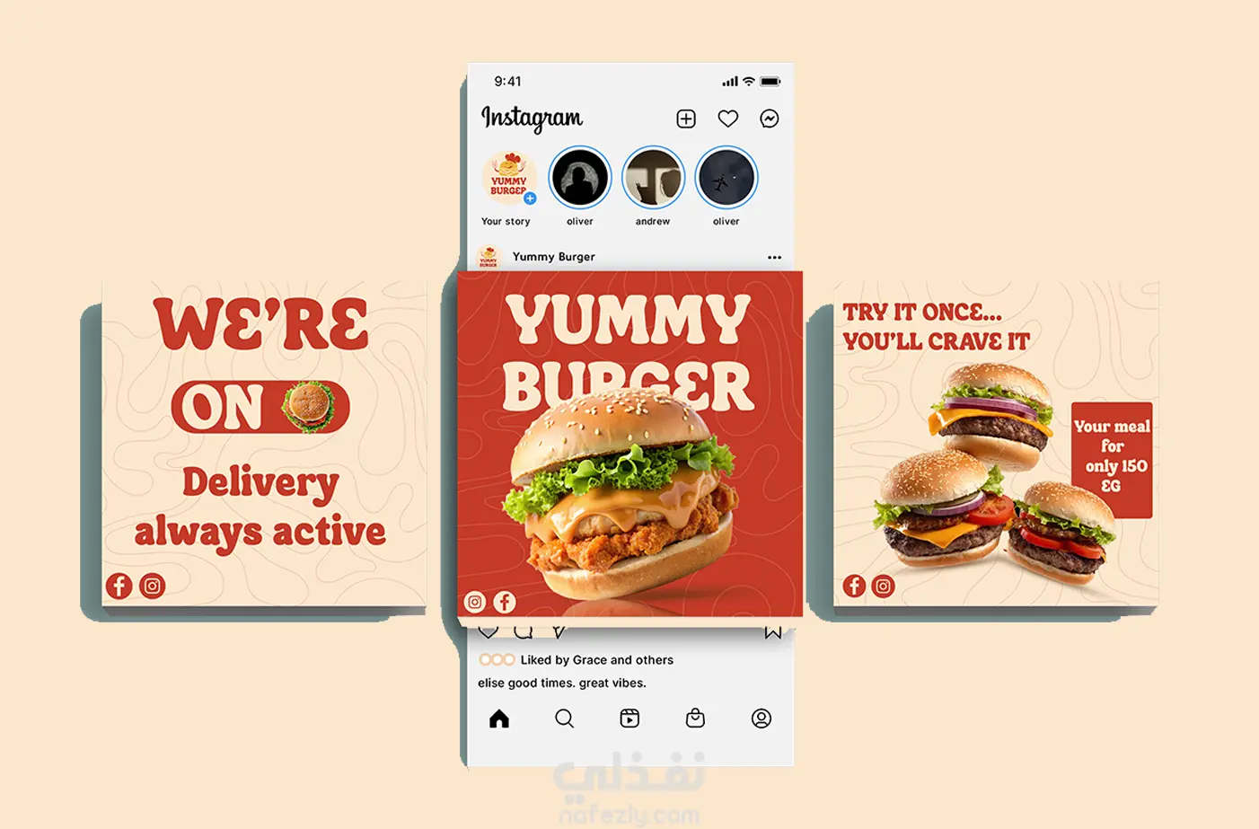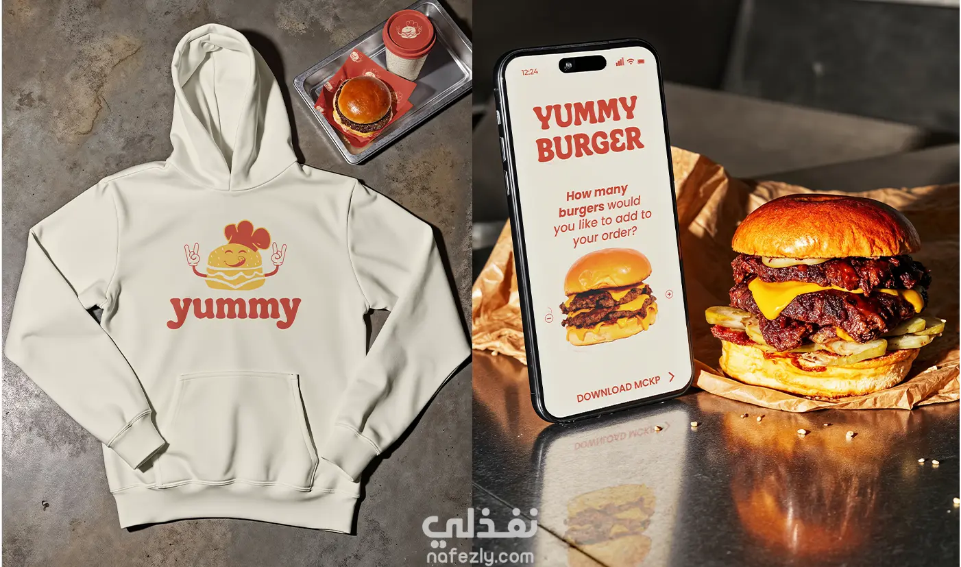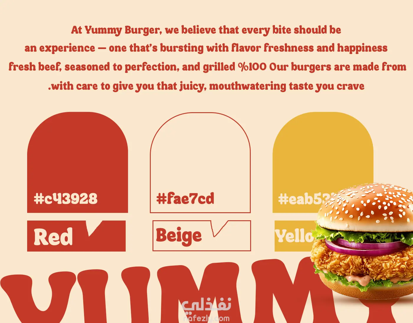 استخدمت ألوان دافئة وشهية مثل الأحمر والأصفر لإبراز روح الطعام السريع والمرح.