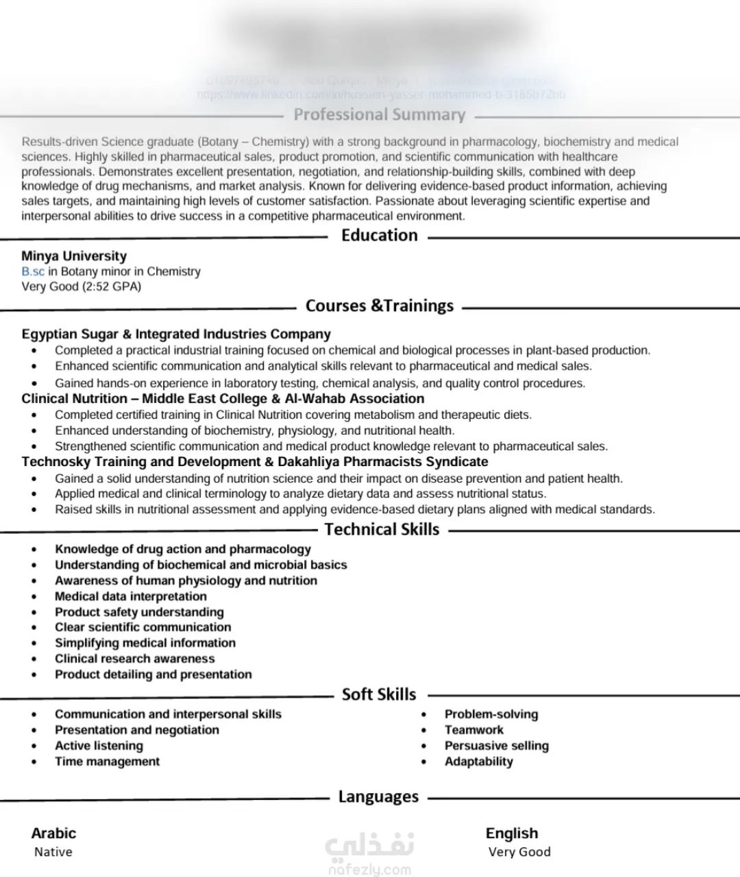 قمت بتصميم سيرة ذاتية احترافية لمندوب دعاية طبية حديث التخرج، ركزت فيها على إبراز المهارات الشخصية والتواصلية، ومعرفة المنتجات الدوائية، والقدرة على بناء علاقات مهنية فعّالة مع الأطباء والصيادلة. اعتمدت تصميمًا أنيقًا ومنظمًا يُظهر الجانب العلمي إلى جانب المهارات التسويقية، مع التركيز على التدريب العملي والمشروعات التي تدعم فهم المرشح للمجال الطبي والتسويقي. تم استخدام كلمات مفتاحية قوية مرتبطة بمجال المبيعات الطبية لزيادة توافق السيرة مع أنظمة الـATS وضمان ظهورها بشكل احترافي أمام مسؤولي التوظيف في شركات الأدوية.