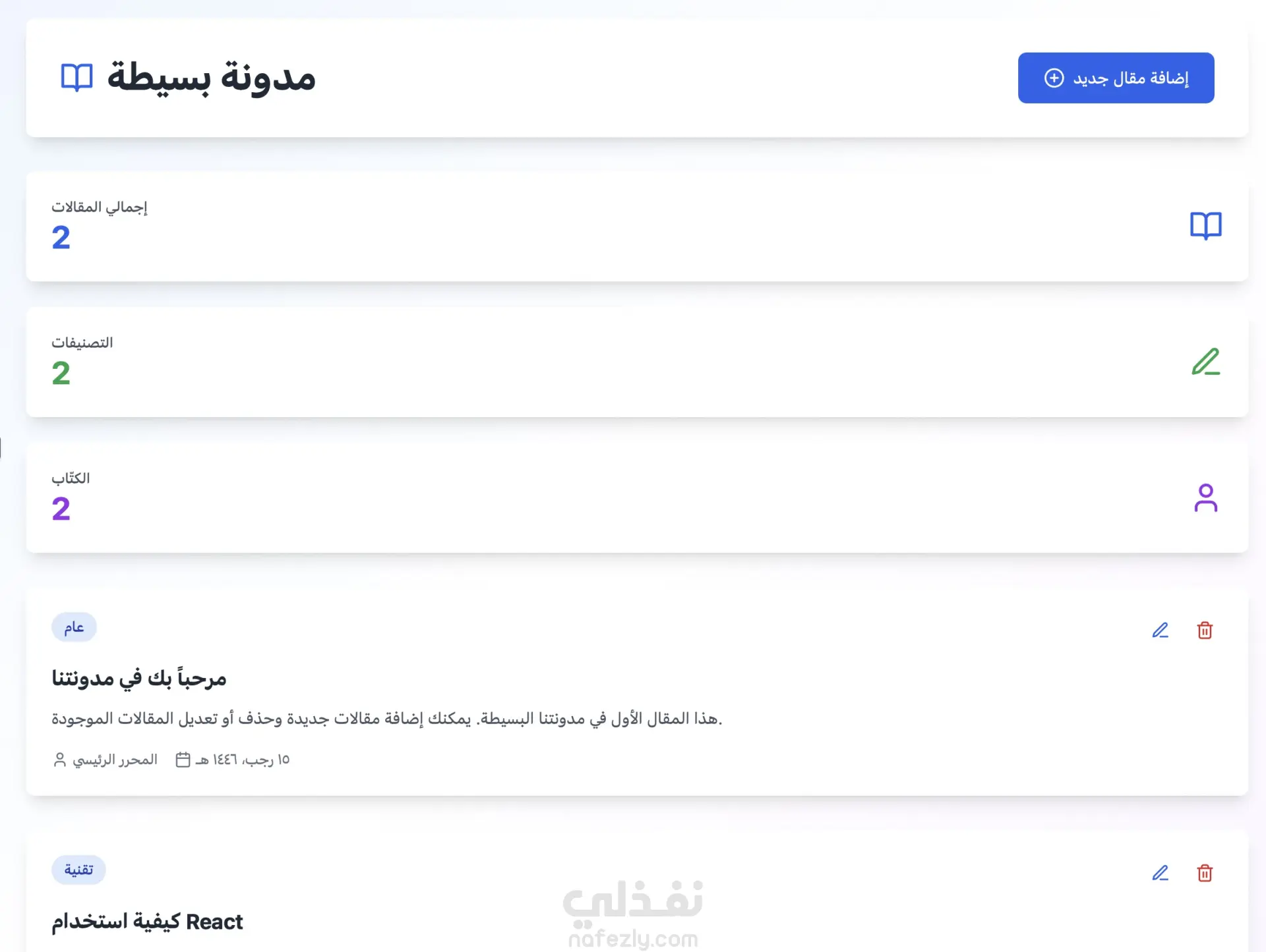 "تطبيق مدونة عصري وبسيط، مُصمم بالكامل باستخدام React وTailwind CSS، وهو مثالي لأصحاب المحتوى أو الشركات التي تحتاج إلى واجهة أمامية جذابة وسريعة." هذا التطبيق يعمل كتطبيق مدونة متكامل، حيث يمكنك: إنشاء المقالات (Create): إضافة منشورات جديدة بسهولة. قراءة المقالات (Read): عرض محتوى المدونة بتصميم نظيف وجذاب. تعديل المقالات (Update): تحرير أي مقال تم نشره مسبقاً. حذف المقالات (Delete): إزالة أي منشور بضغطة زر. المزايا التقنية التي تهمك: لا يتطلب خادم (Backend): يتم إدارة جميع المقالات والتحديثات باستخدام تقنية React Hooks، مما يجعله خفيفًا وسريعًا جدًا. تصميم متجاوب (Responsive): يعمل بكفاءة وشكل ممتاز على جميع الأجهزة (الموبايل، التابلت، والكمبيوتر). واجهة مستخدم حديثة: تم استخدام Tailwind CSS لضمان تصميم احترافي ونظيف وجذاب.