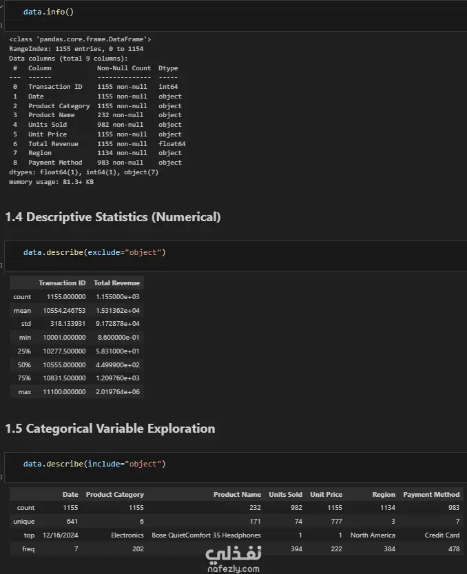 بناء سير عمل منظم لتحليل البيانات الاستكشافي (EDA) لتحديد الأنماط، والقيم الشاذة، والعلاقات بين المتغيرات. تطبيق الأساليب الإحصائية لتلخيص الخصائص الأساسية واكتشاف الاتجاهات الخفية. تصميم رسوم بيانية تفاعلية وجذابة (مخططات التوزيع، الرسوم المبعثرة، خرائط الارتباط الحرارية). ترجمة النتائج التحليلية إلى استنتاجات واضحة وقابلة للتنفيذ لدعم اتخاذ القرار.