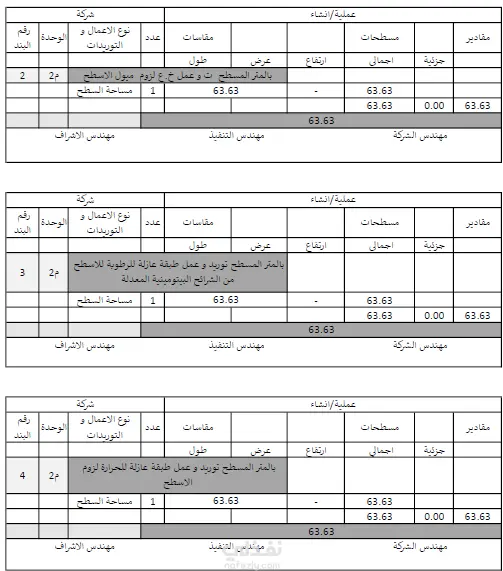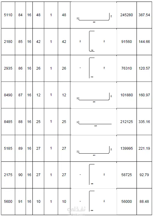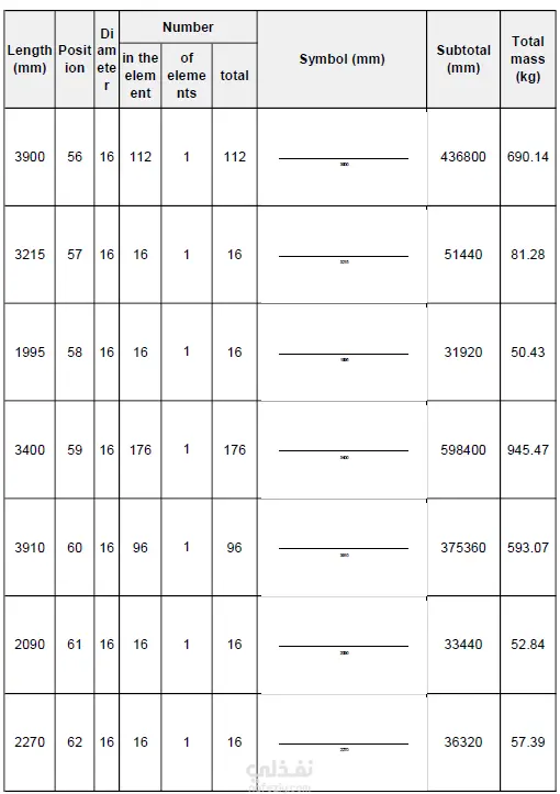 و ذلك لحجم الخرسانة للعناصر الانشائية من بلاطات و اعمدة وجسور و اساسات و غيرها , كما تم تنظيم جداول تفصيل التسليح بشكل دقيق و