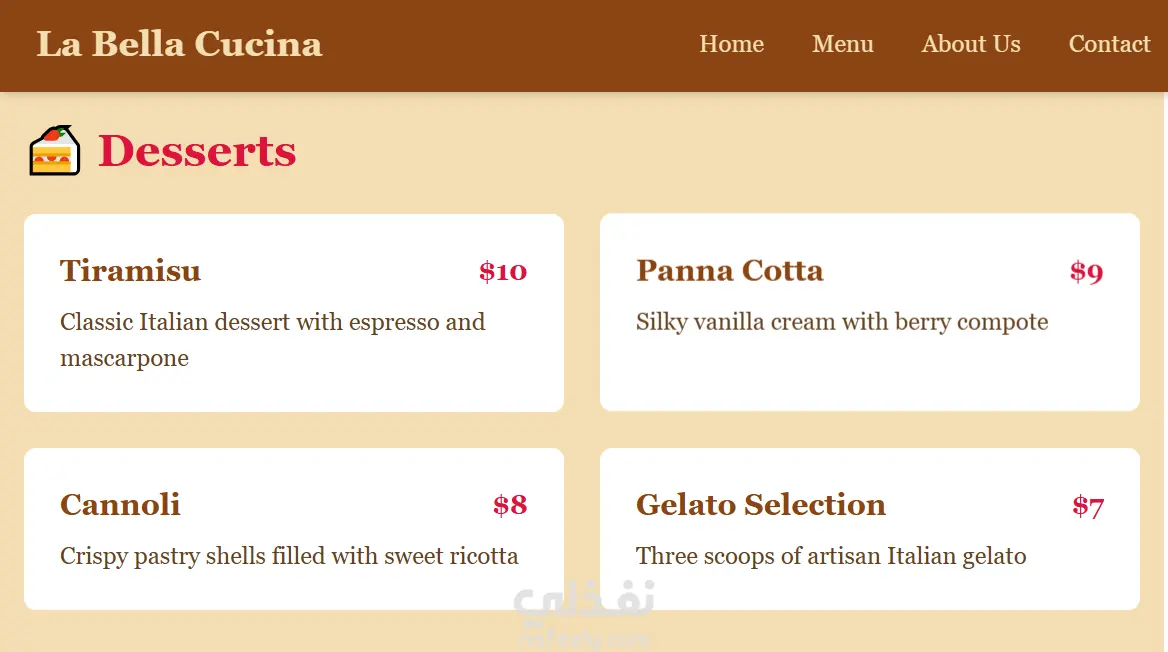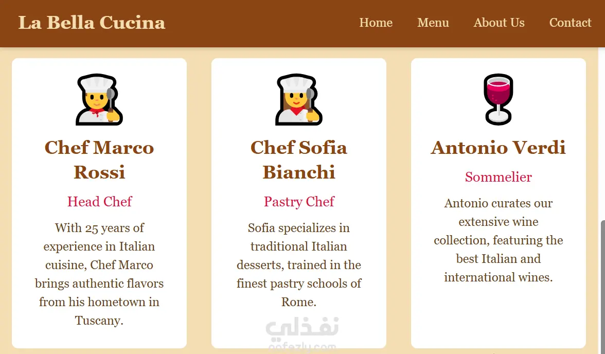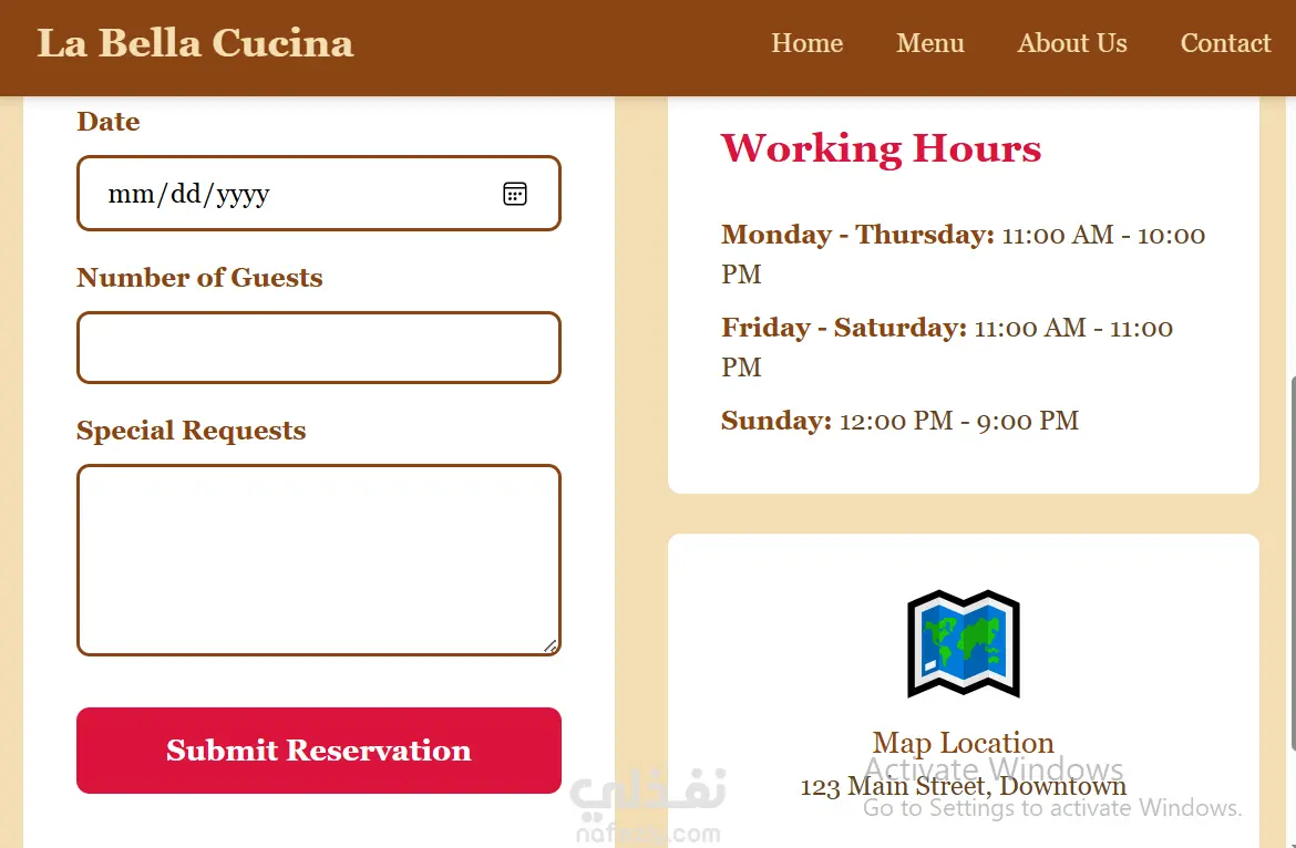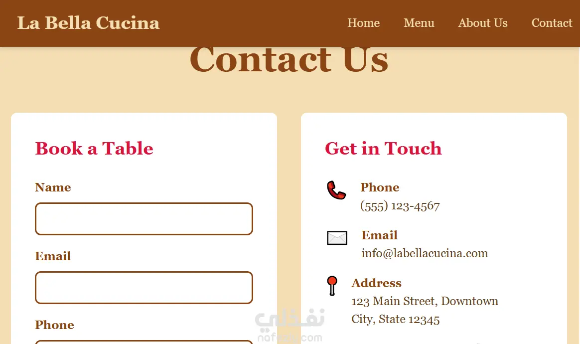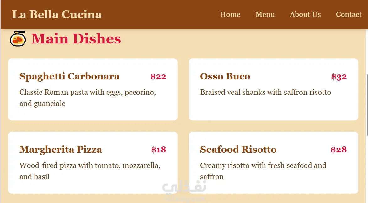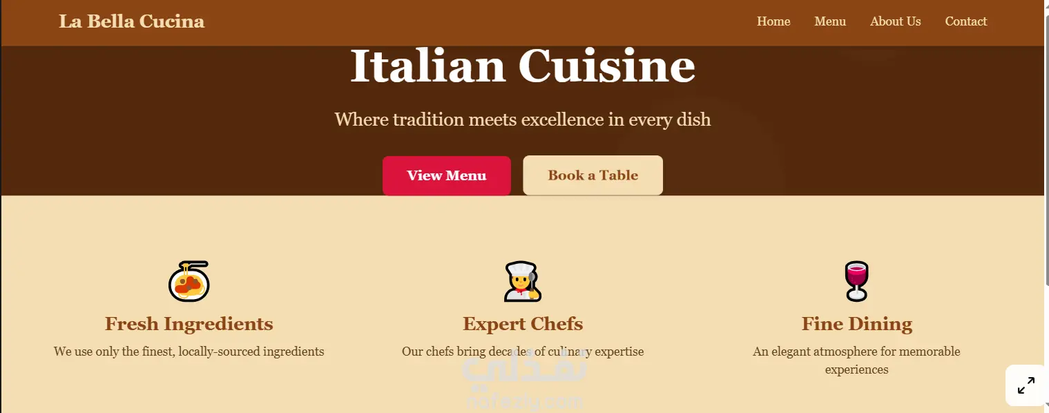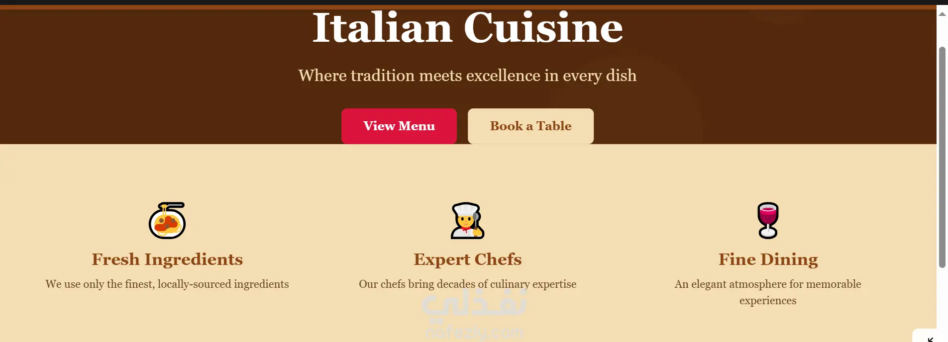 you need a professional and modern restaurant website design. The website should include the following pages: Home Page: with a large hero image, a welcoming slogan, and buttons (View Menu / Book a Table). Menu Page: sections for Starters, Main Dishes, Desserts, and Drinks. About Us Page: to introduce the restaurant, its story, and the team. Contact Page: with a contact form, map location, phone number, and working hours. The design should use warm colors (red, beige, dark brown) to create a cozy and elegant atmosphere.