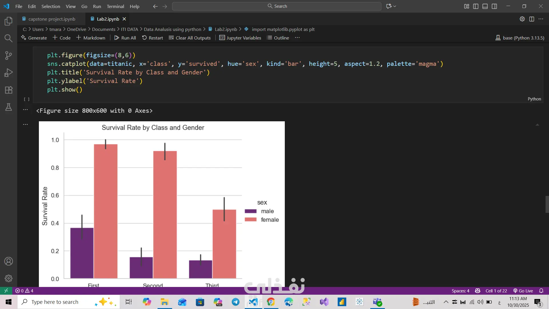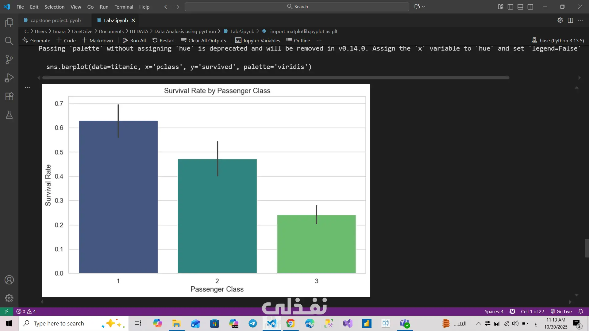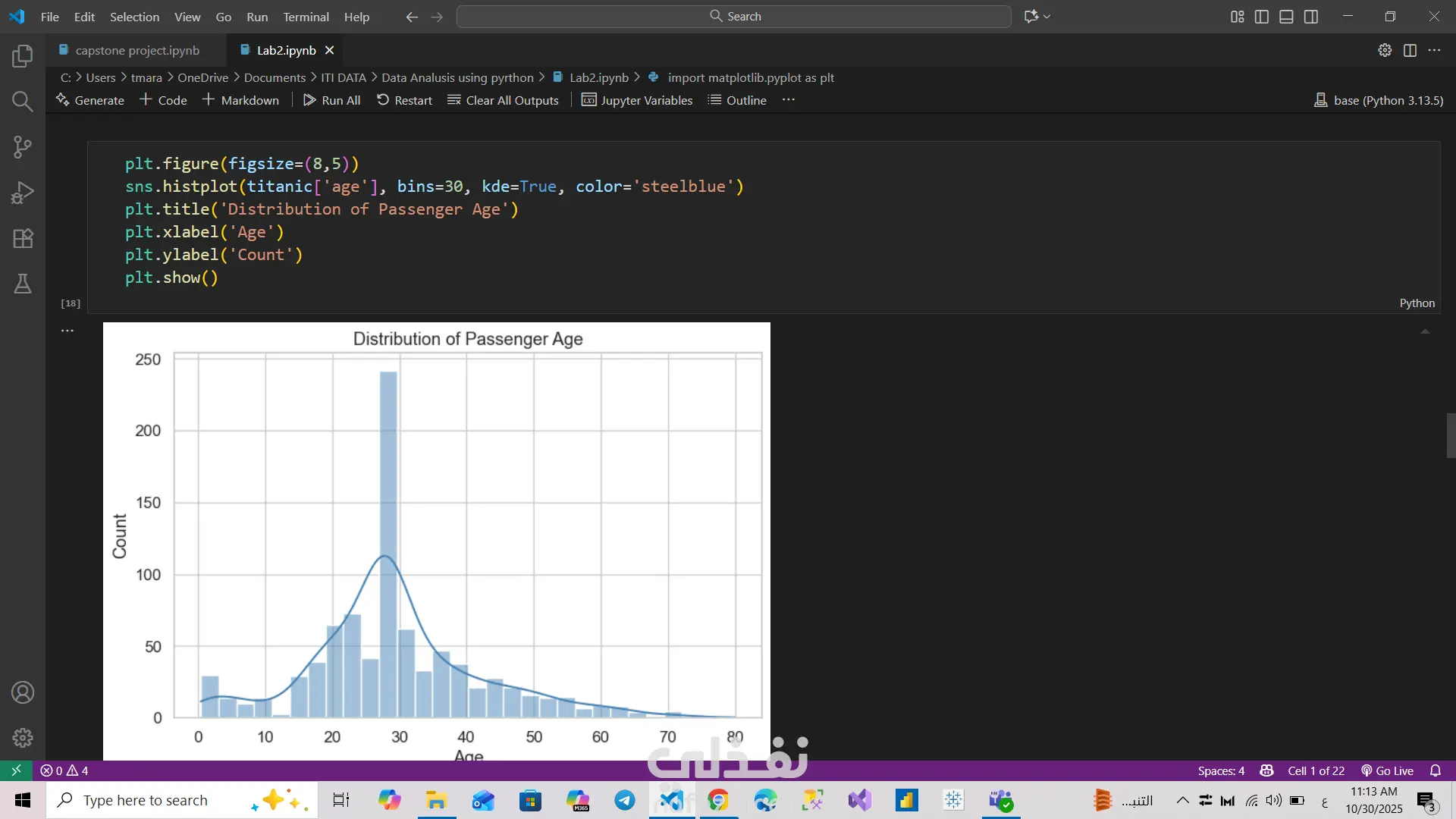 في هذا التحليل استخدمت مكتبة Seaborn في بايثون لإنشاء رسم بياني يوضّح توزيع أعمار ركّاب سفينة تايتانيك. الهدف من الرسم هو فهم الفئات العمرية الأكثر تواجدًا على متن السفينة، ومعرفة ما إذا كان العمر عاملاً مؤثرًا في معدلات النجاة لاحقًا. يُظهر الرسم أن أغلب الركّاب كانوا في الفئة العمرية من 20 إلى 40 عامًا، بينما كانت نسبة الأطفال وكبار السن أقل بكثير. هذا التحليل يساعد في تكوين فكرة أولية عن طبيعة الركّاب ويُمهّد لربط الأعمار بعوامل أخرى مثل النجاة أو الدرجة الاجتماعية.