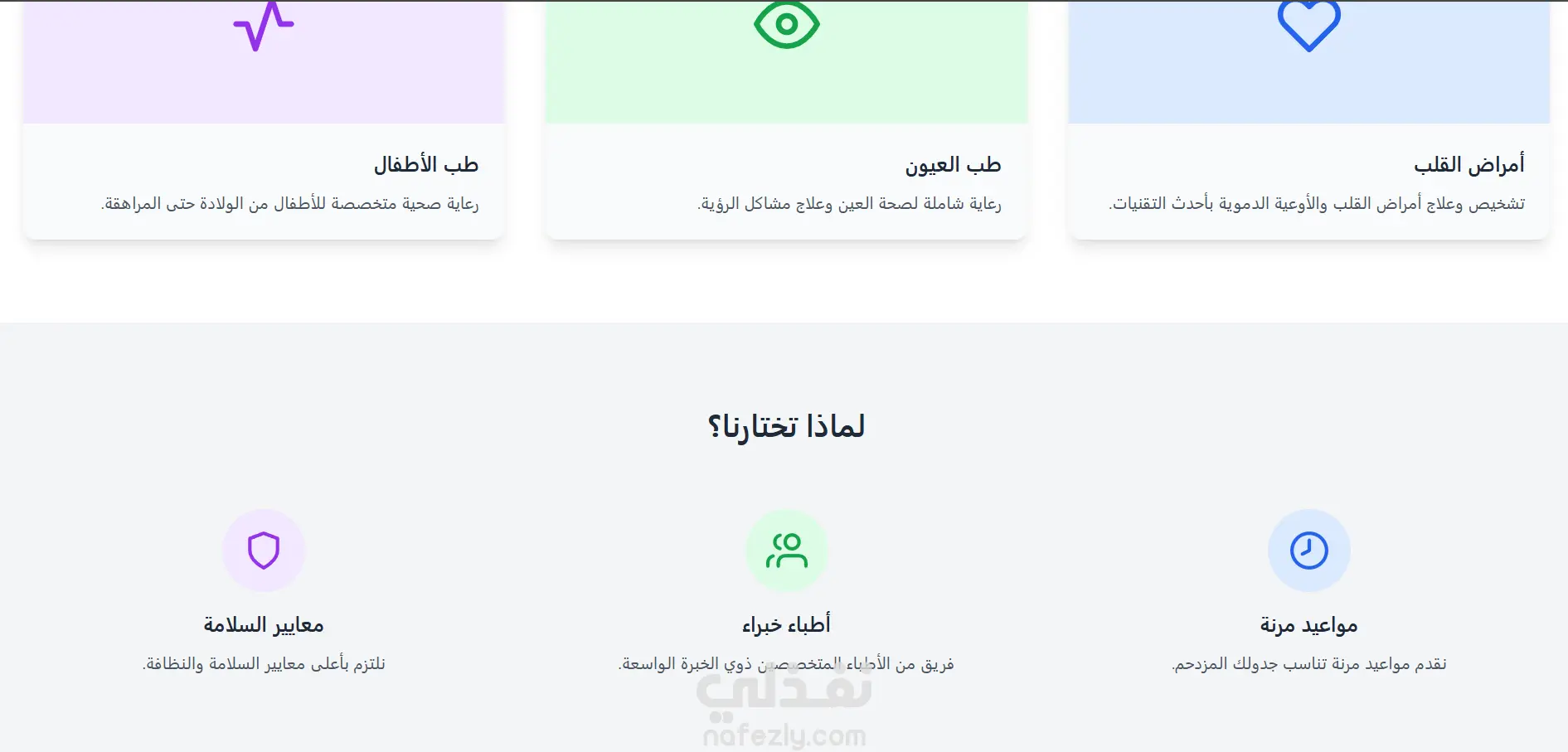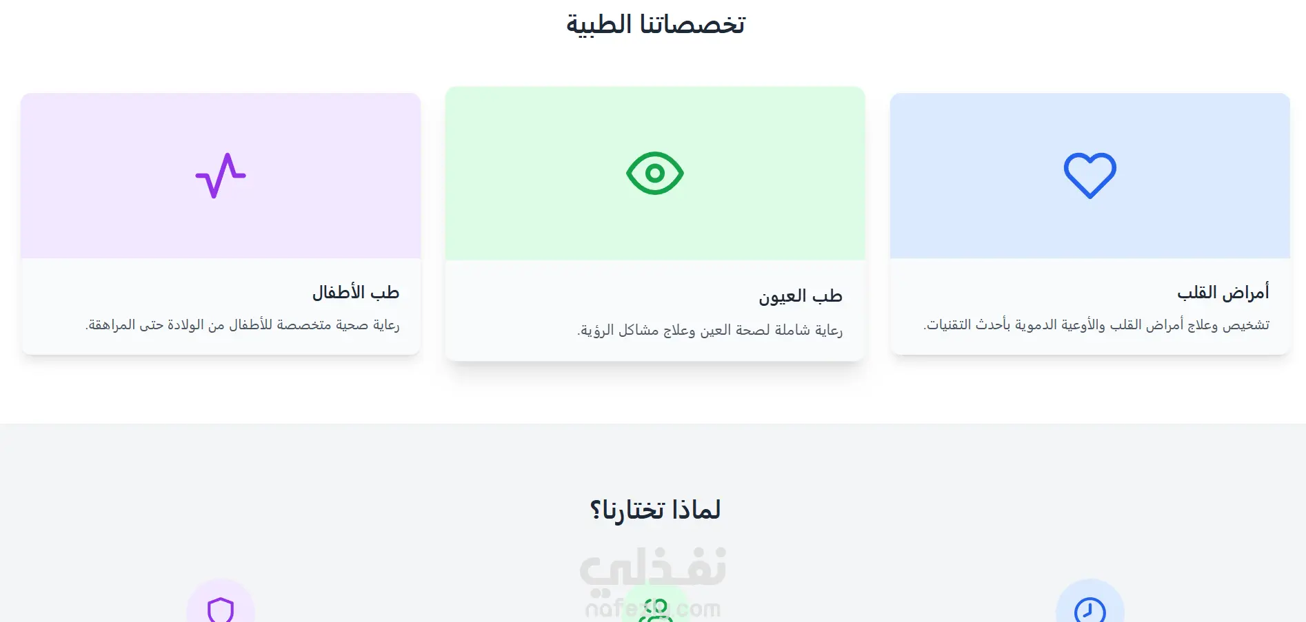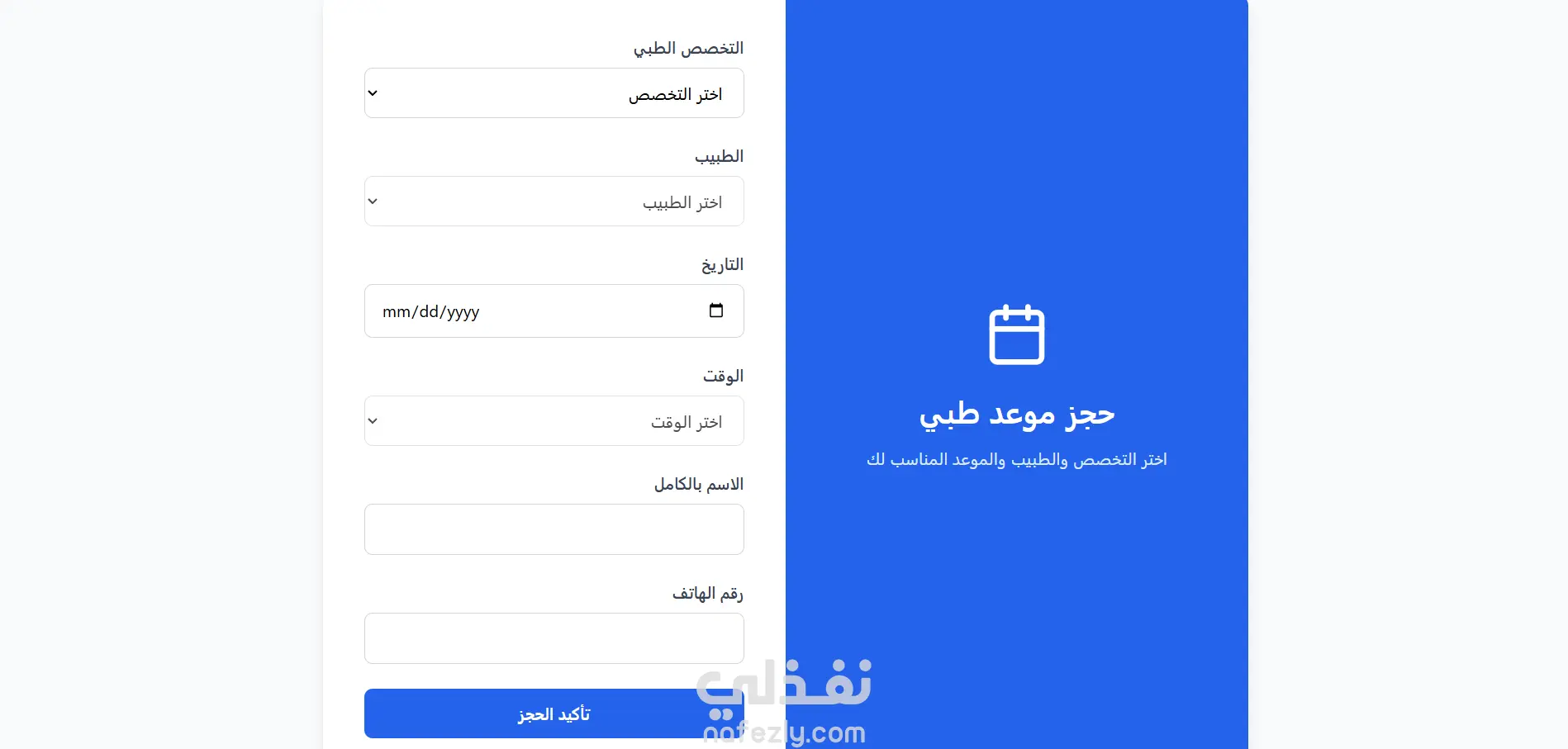نظرة عامة MediCare Hub هو موقع ويب طبي متكامل يقدم خدمات حجز المواعيد الطبية عبر الإنترنت، مصمم خصيصاً للمستخدمين الناطقين باللغة العربية. الهدف الرئيسي تسهيل عملية حجز المواعيد الطبية وتقديم معلومات عن التخصصات والخدمات الطبية المتاحة في مركز الرعاية الصحية. المميزات الرئيسية 1. واجهة مستخدم عربية متكاملة تصميم RTL (من اليمين لليسار) مخصص للغة العربية واجهة مستخدم بديهية وسهلة الاستخدام تصميم متجاوب يعمل على جميع الأجهزة 2. نظام حجز المواعيد اختيار التخصص الطبي من قائمة متنوعة اختيار الطبيب بناءً على التخصص المحدد تحديد التاريخ والوقت المناسب إدخال بيانات المريض (الاسم ورقم الهاتف) 3. تخصصات طبية متعددة أمراض القلب طب العيون طب الأطفال طب الأعصاب جراحة العظام 4. تصميم جذاب وتفاعلي خلفية ثلاثية الأبعاد باستخدام Vanta.js في الصفحة الرئيسية رسومات Feather Icons تأثيرات حركية وأنيميشن تصميم بطاقات تفاعلية للتخصصات الطبية Frontend Technologies: HTML5 مع دعم RTL CSS3 مع Tailwind CSS JavaScript (Vanilla) Feather Icons للرموز Vanta.js للخلفيات ثلاثية الأبعاد Three.js للرسومات ثلاثية الأبعاد الميزات التقنية: تصميم متجاوب (Responsive Design) تحسينات أداء الصفحات تجربة مستخدم سلسة تنقل سلس بين الصفحات