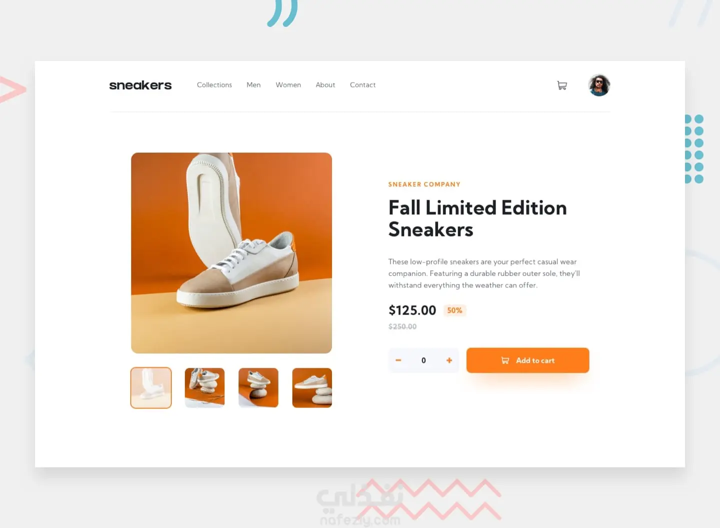 أخذت التصاميم من موقع للتحديات في 2023 لمطوري واجهة المستخدم ورفعته للتصفحه اليوم، المشروع فيه الصفحة الرئيسية للمنتج بصور مختلفة والقدرة على إضافة المنتج للسلة ومحاكاة الشراء (قبل احترافي للتطوير الكامل للمشاريع full stack development بسنتين)