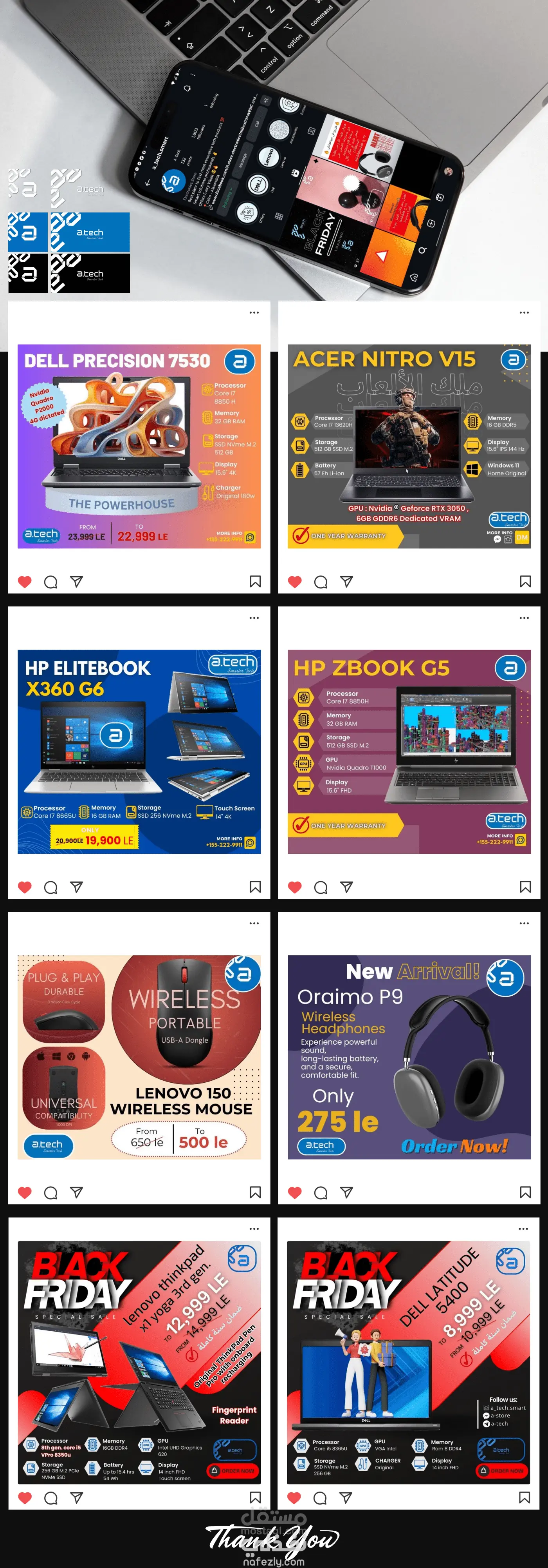 تصميم مجموعة من البوستات الإعلانية لشركة A Tech المتخصصة في الإلكترونيات، بهدف الترويج للمنتجات والعروض الخاصة على منصات التواصل الاجتماعي.