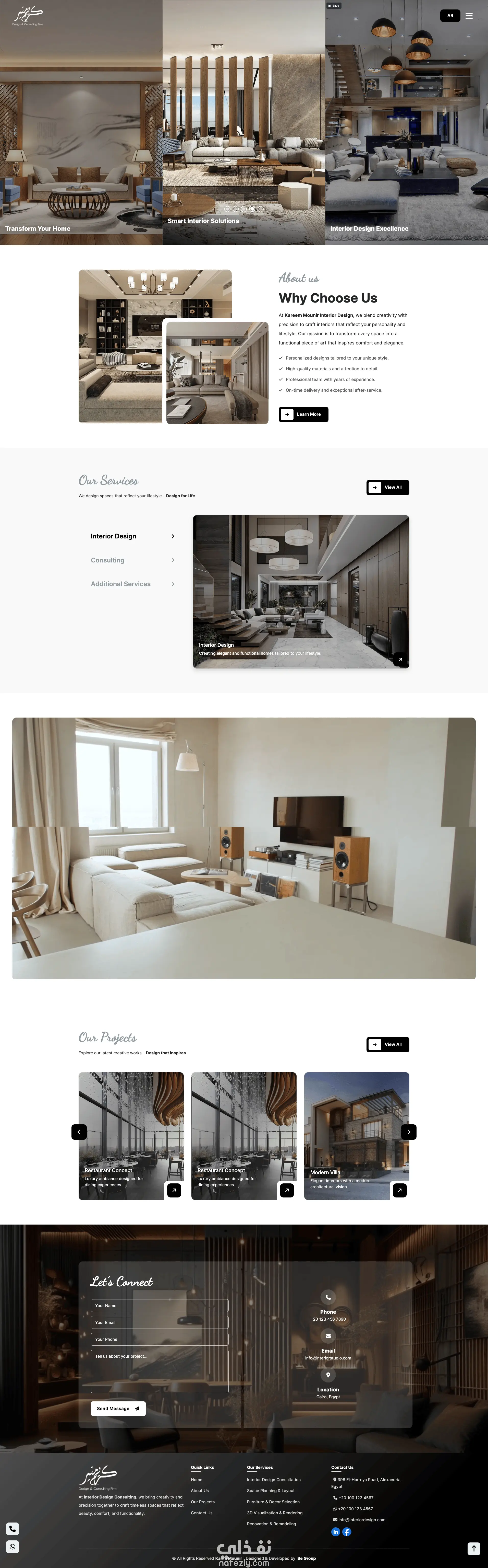 قمت بتصميم وتطوير موقع تعريفي احترافي لشركة Karim Mounir – Interior Design & Consulting، المتخصصة في التصميم الداخلي والاستشارات الهندسية. تم إنشاء الموقع ليعكس فلسفة الشركة وشعارها “DESIGN FOR LIFE”، من خلال واجهة أنيقة توضح مشاريعها، خدماتها، ورؤيتها في تحويل المساحات إلى تجارب معيشية فريدة تجمع بين الجمال والوظيفة. اعتمد التصميم على الألوان الهادئة والخطوط العصرية التي تعبر عن الفخامة والرقي، مع عرض المشاريع بطريقة منظمة وسهلة التصفح.