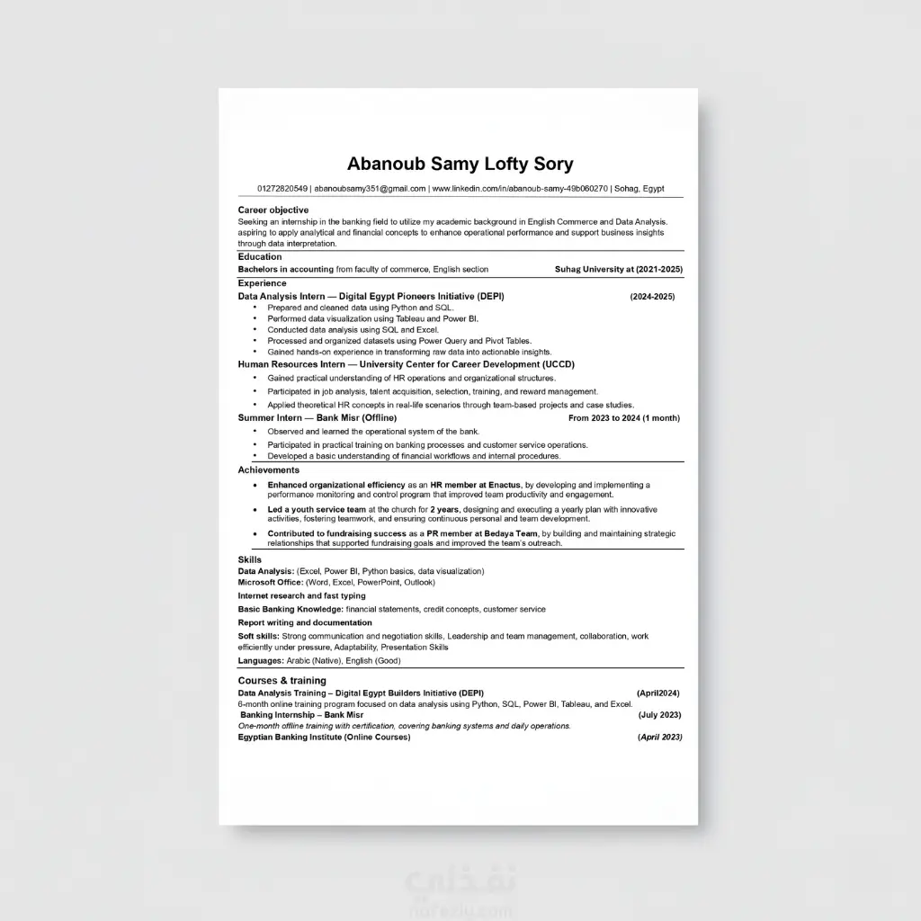 قمت بتصميم سيرة ذاتية احترافية بالكامل من الصفر بتنسيق حديث وبسيط يتوافق مع أنظمة تتبع المتقدمين (ATS). شمل العمل تحليل خلفية العميل، وإعادة صياغة أقسام السيرة الذاتية مثل الملخص المهني والمهارات والخبرات، مع تحسين الكلمات المفتاحية لتناسب مجاله الوظيفي. تم اختبار السيرة الذاتية على أدوات ATS وحققت نتيجة تفوق 90%، مما يضمن ظهورها بشكل احترافي في أنظمة التوظيف.