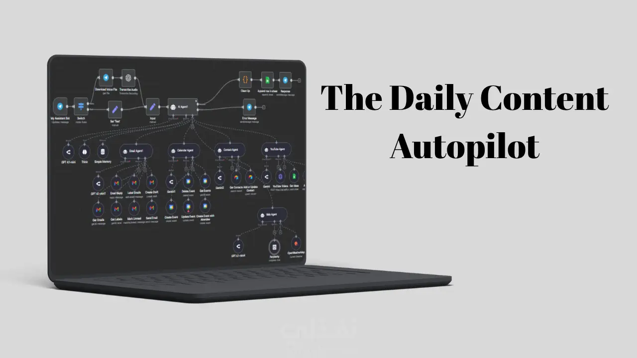 مشروعي هو نظام ذكي متكامل (The Daily Content Autopilot) صُمم لأتمتة عملية إنشاء المحتوى اليومي بالكامل — من توليد الأفكار إلى الجدولة والنشر — بالاعتماد على الذكاء الاصطناعي ودمج عدة أدوات إنتاجية مثل Notion، Gmail، Google Calendar، YouTube، وWeb Search.