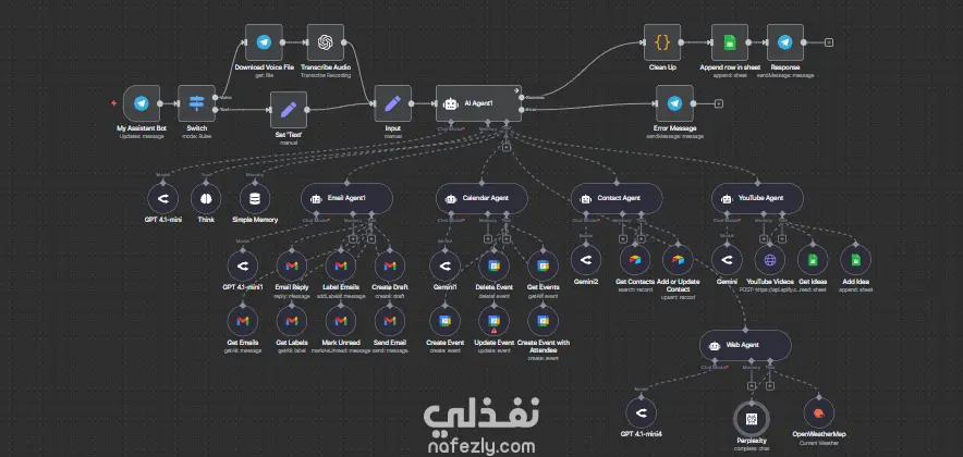 النظام مبني على منصة n8n ويعتمد على مجموعة من الوكلاء الذكيين (AI Agents) الذين يعملون معًا بشكل منسق لإنجاز كل المهام المطلوبة: