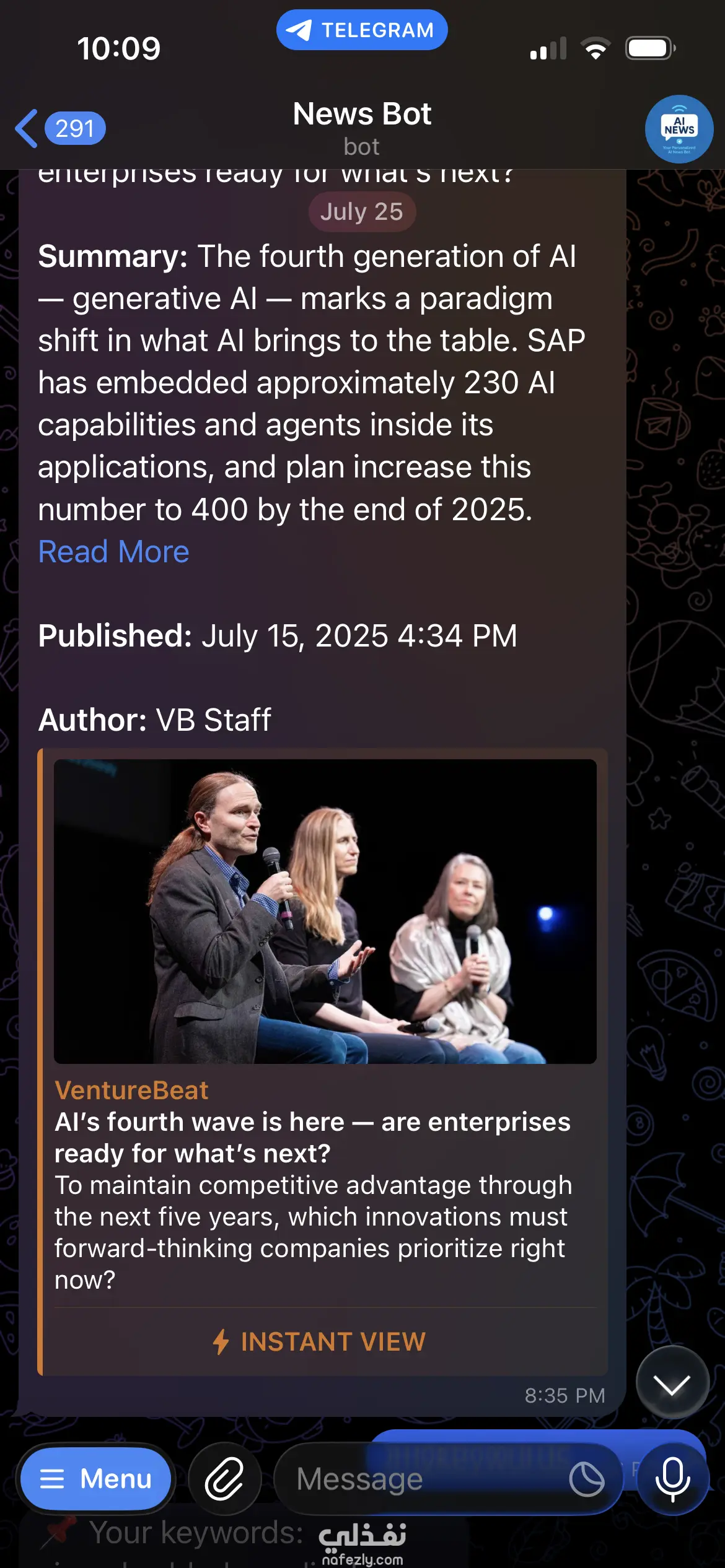 1- البوت بيعمل web scraping من مواقع أخبار AI 2- بيلخص المقالات باستخدام نموذج BART من Hugging Face 3- ويبعتهالك لو لقى فيها كلمات انت مهتم بيها (زي: AI, Medical, Embedded) يعني بدل ما تقرأ ١٠٠ خبر في اليوم، البوت بيختارلك اللي يهمك بس. عملته عشان أكون دايمًا متابع المجالات اللي بتعلم فيها من غير دوشة، وأعتقد أي حد مهتم بـ AI هيفيده.