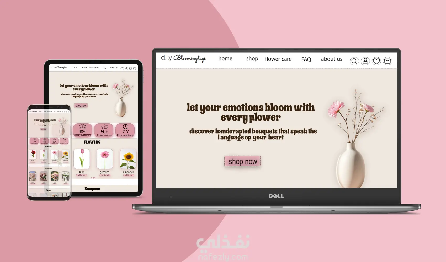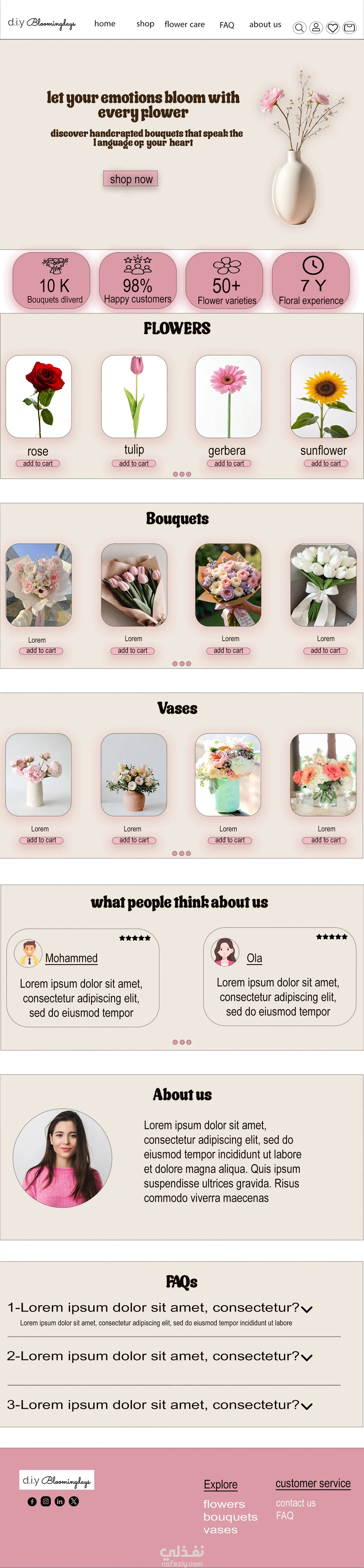 الموقع عبارة عن موقع لبيع الزهور ويوجد به عدة خيارات حيث يمكن أن يجمع المستخدم الازهار التي يريدها ويصنع البوكية الخاص به ويوجد أيضا تصميمات جاهزة يختار من بينها