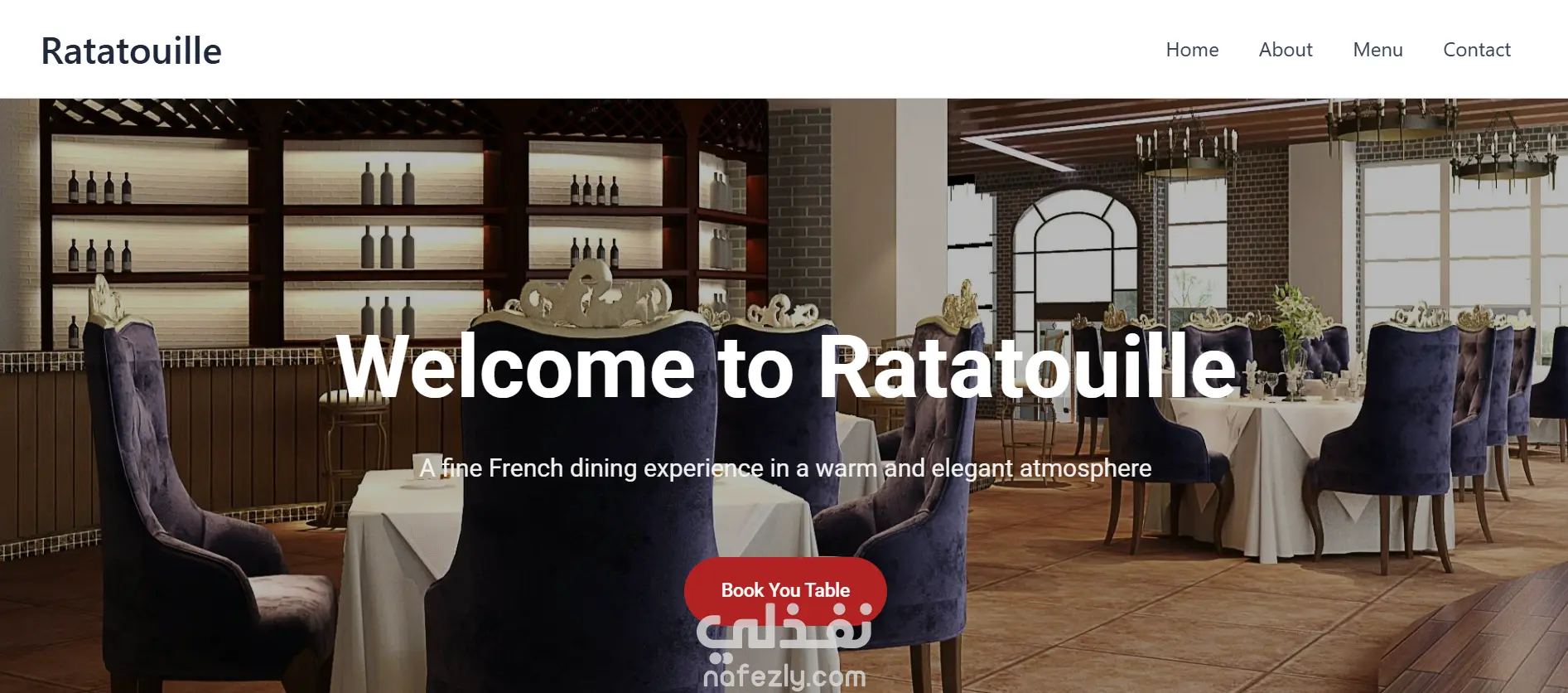 صفحة هبوط لمطعم متجاوبة مع جميع الشاشات سواء كمبيوتر أو لاب توب الأقسام : 1 - قسم Home 2 - قسم About لعرض معلومات عن المطعم وأهم مميزاته 3 - قسم Menu لعرض الأكلات التي يوفرها المطعم 4 - قسم Contact للتواصل مع طاقم عمل المطعم