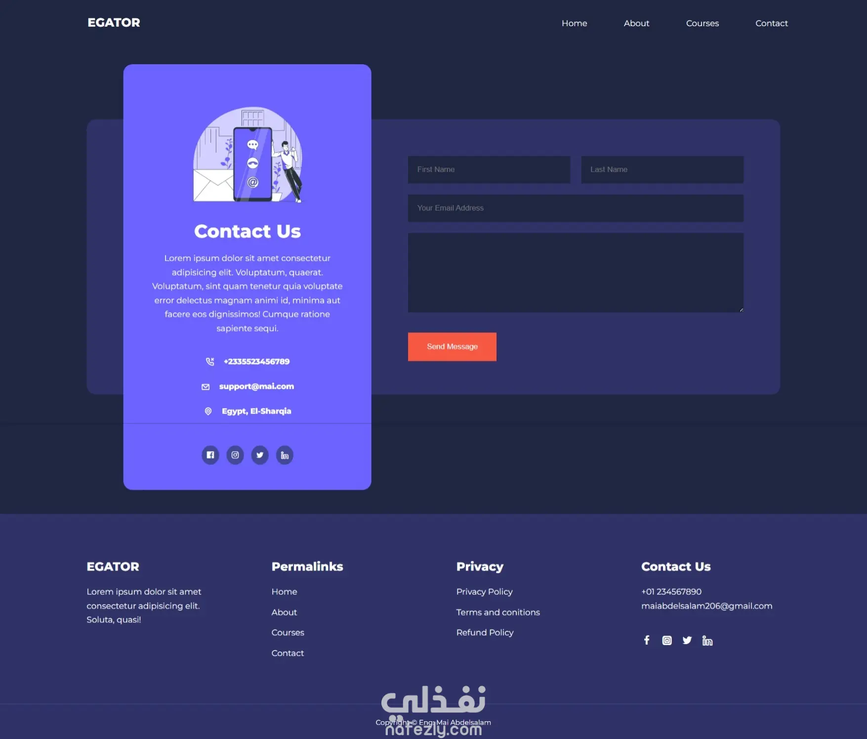 Contact Page: نموذج تواصل بسيط وفعّال مع وسائل تواصل مباشرة.