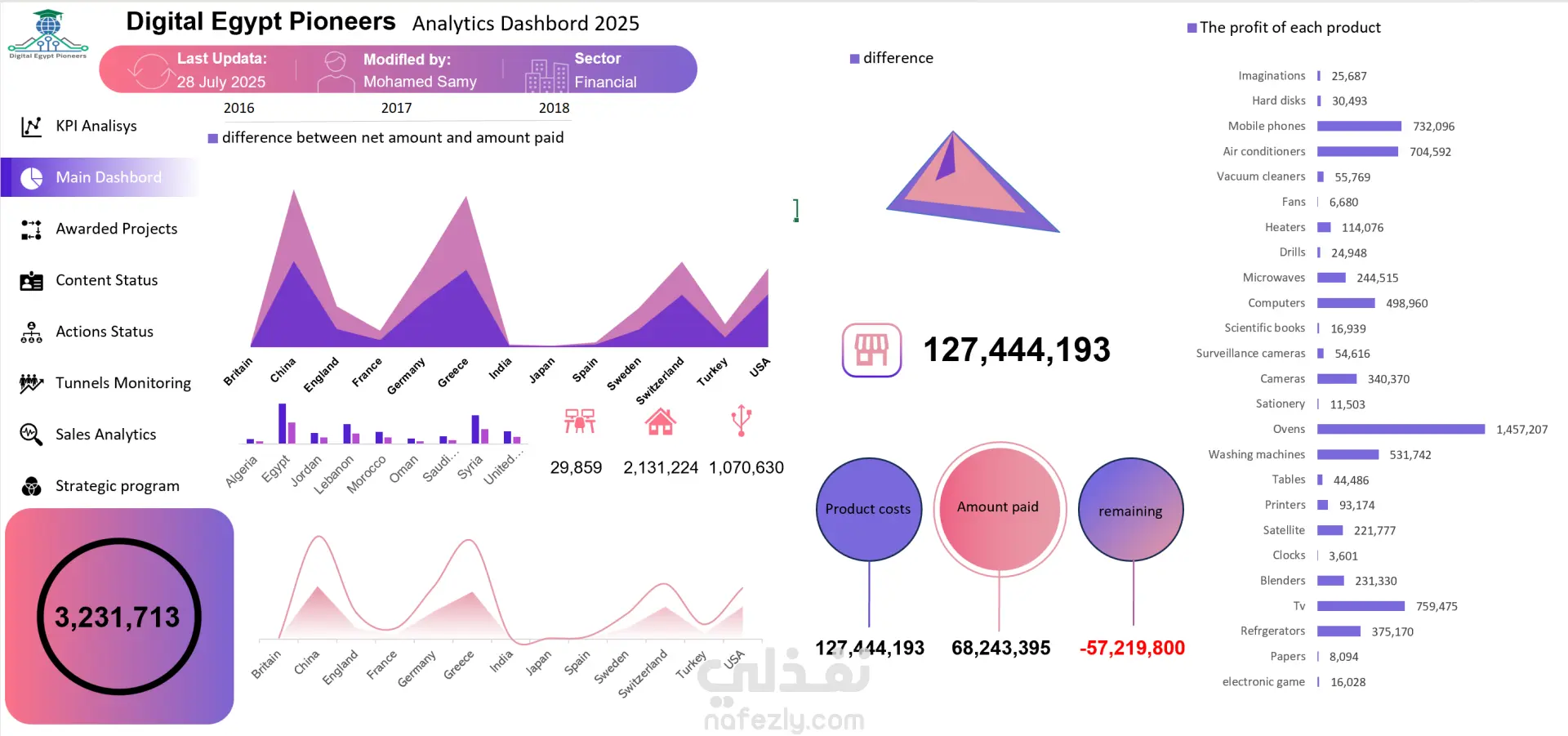 تم إعداد لوحة معلومات تحليلية متكاملة لعرض الأداء المالي ومؤشرات الأرباح والتكاليف عبر عدد من الدول والمنتجات خلال الأعوام (2016 – 2018). اللوحة مصممة بتصميم عصري وواضح، وتشمل ما يلي: تحليل الفرق بين صافي المبلغ والمبلغ المدفوع: عرض بياني للدول المختلفة (بريطانيا، الصين، ألمانيا، الهند، أمريكا...). توضيح الفروقات في الأداء المالي بين الفترات الزمنية. تحليل الأرباح لكل منتج (Product Profitability): مقارنة أرباح المنتجات مثل: Ovens (1,457,207) TVs (759,475) Mobile phones (732,096) Air conditioners (704,592) Computers (498,960) توضيح المنتجات الأقل ربحية لتحليل فرص التحسين. المؤشرات المالية الرئيسية (KPIs): إجمالي المبالغ: 127,444,193 المبلغ المدفوع: 68,243,395 الفرق أو المتبقي: –57,219,800 إجمالي المعاملات أو المشاريع: 3,231,713 تحليل إقليمي: مقارنة الأداء عبر دول متعددة في أوروبا وآسيا وأفريقيا (مثل مصر، السعودية، اليونان، الصين...). تصميم تفاعلي ومنظم: قوائم جانبية للأقسام (KPI Analysis، Sales Analytics، Strategic Program، إلخ). استخدام رموز وألوان متدرجة (Gradient Colors) لسهولة القراءة.