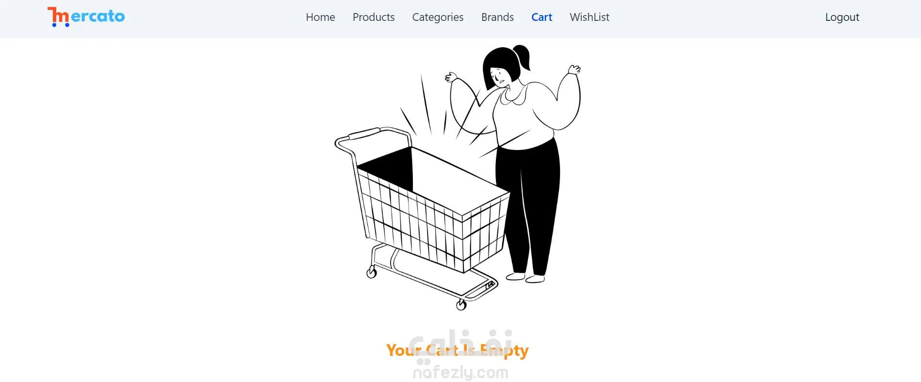 - صفحة مخصصة لعربة التسوق مع إشعارات بالحالة (“Your Cart Is Empty”).