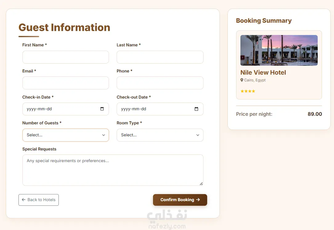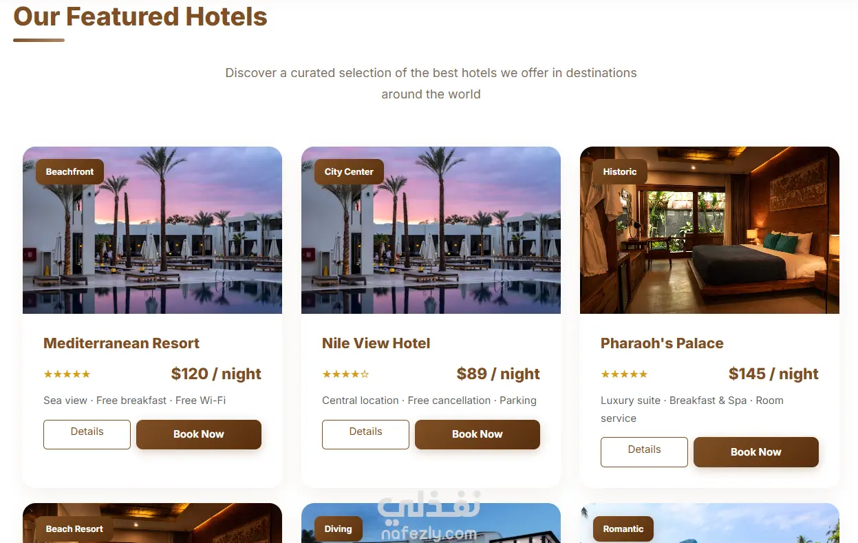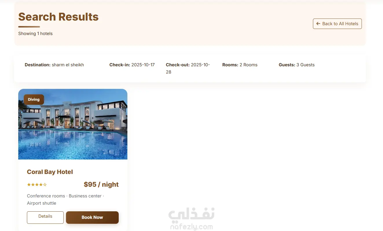 • عرض قائمة الفنادق مع الصور، التقييم، السعر، المزايا، وأزرار الحجز