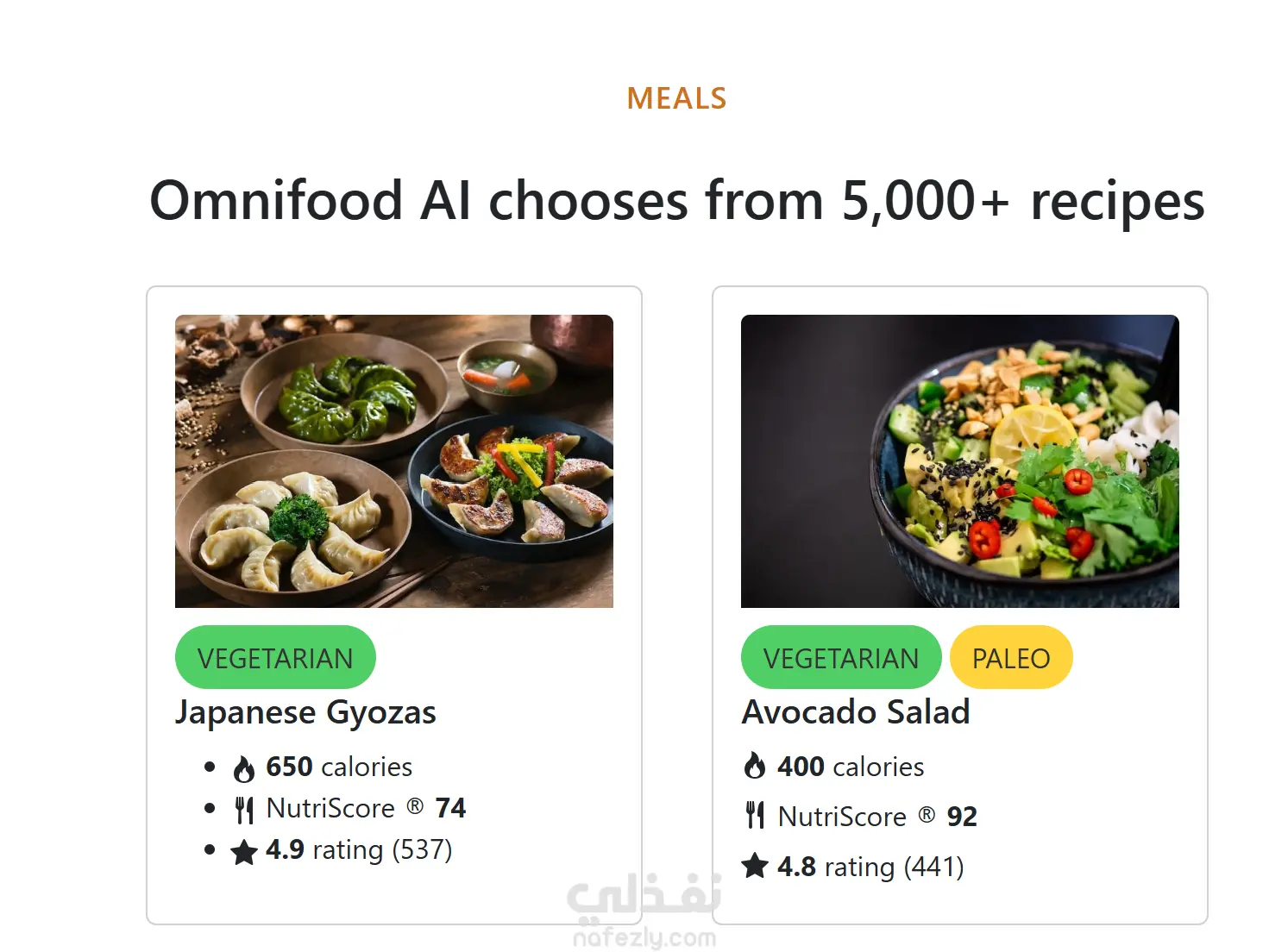 A Meals section displaying different meal options with details like calories, nutrition score, and user ratings.