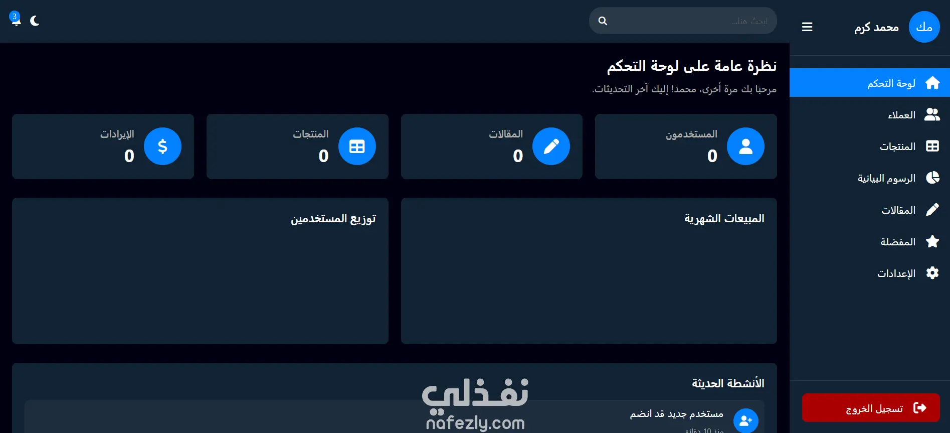 لوحة تحكم (Admin Dashboard) تفاعلية تعرض بيانات المستخدمين والإحصائيات بطريقة منظمة. تضم بطاقات معلومات، جداول، وأقسام إدارية بتصميم متجاوب وحديث. الهدف منها إبراز مهارات التعامل مع البيانات والعرض البصري باستخدام JavaScript. التقنيات: HTML, CSS, JavaScript