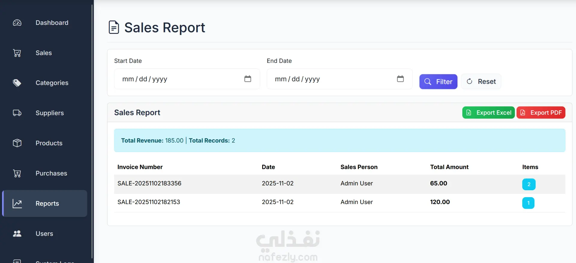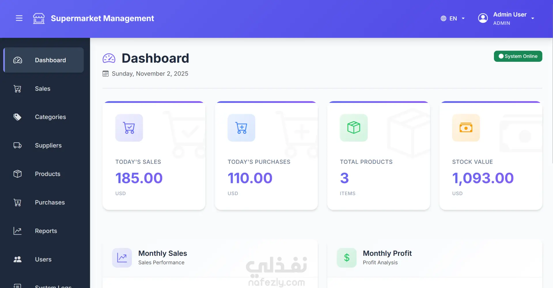 نظام إدارة سوبر ماركت احترافي لعرض ومتابعة المبيعات، المخزون، الأرباح والمشتريات من خلال لوحة تحكم سهلة الاستخدام. يدعم إدارة المنتجات والأقسام والموردين والفواتير مع تقارير مفصلة وتصدير PDF/Excel. النظام يوفر إحصائيات يومية وشهرية مع رسومات بيانية، وإدارة مستخدمين وصلاحيات. مناسب للمحلات والسوبر ماركت لإدارة العمليات بكفاءة ودقة.