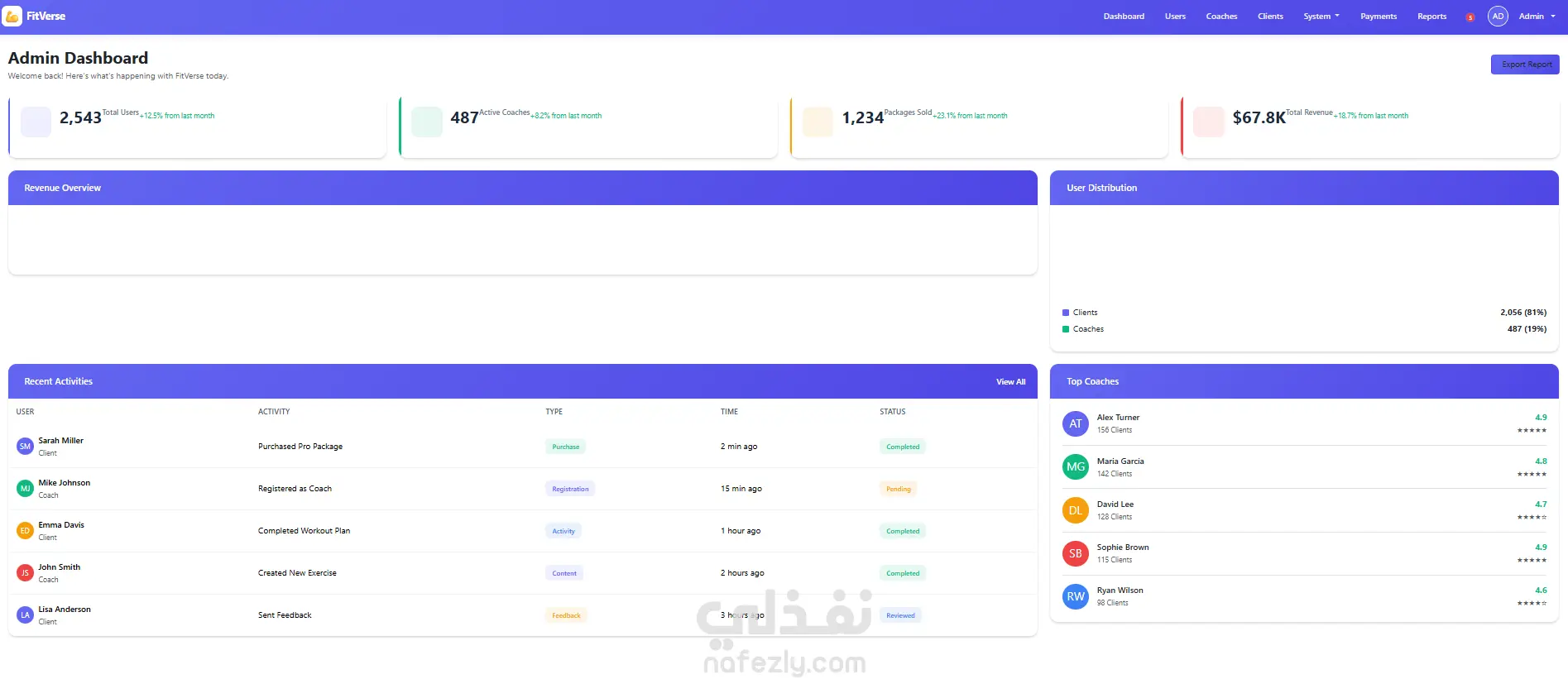FitVerse – لوحة تحكم شاملة لإدارة الجيم والعملاء وخطط التدريب