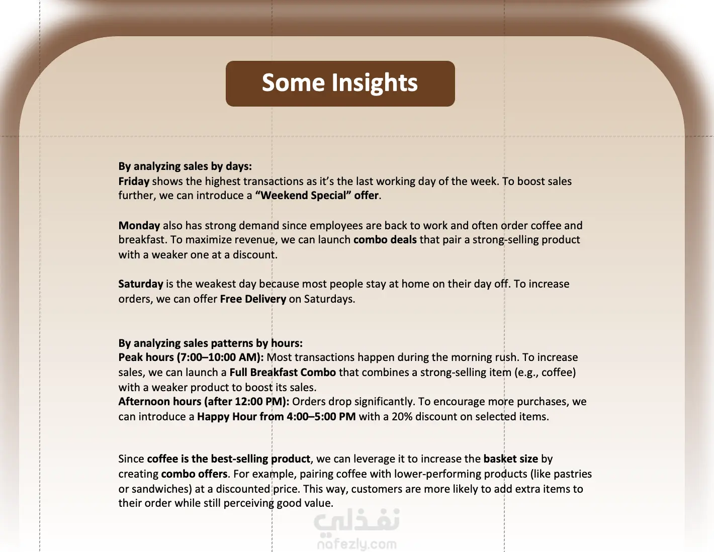 قمت بتصميم وتحليل لوحة تحكم تفاعلية (Sales Dashboard) لقياس أداء سلسلة مقاهي خلال أول ستة أشهر من السنة، وذلك باستخدام برنامج Tableau. تهدف الداشبورد إلى دعم أصحاب القرار في فهم المبيعات بشكل أعمق من خلال تتبع الإيرادات وعدد العمليات ومعرفة المنتجات والفروع الأكثر مبيعًا، بالإضافة إلى تحديد أوقات الذروة وأيام النشاط الأعلى. تتضمن الداشبورد مجموعة من المؤشرات والرسوم التحليلية المميزة، منها: إجمالي الإيرادات: $698,812 أفضل منتج مبيعًا: Coffee – بقيمة $269,952 أفضل فرع مبيعًا: Lower Manhattan – بقيمة $230,057 وقت الذروة: الساعة 10:00 صباحًا تحليل الإيرادات شهريًا عبر Line Chart وBar Chart تحليل عدد العمليات حسب: أيام الأسبوع ساعات اليوم فئات المنتجات عرض أفضل 15 منتج مبيعًا في جميع الفروع إمكانية تصفية البيانات حسب: الفروع الشهور أيام الأسبوع تم استخدام تصميم بصري احترافي يعكس هوية القهوة من خلال درجات اللون البني، مع التركيز على وضوح البيانات وسهولة التنقل بينها. ✅ قيمة العمل: يدعم اتخاذ القرارات التشغيلية والتسويقية يساعد في زيادة الربح عبر التركيز على المنتجات والأوقات والفروع الأكثر إنتاجًا مناسب لمالكي المقاهي وسلاسل المطاعم لرفع كفاءة الأعمال